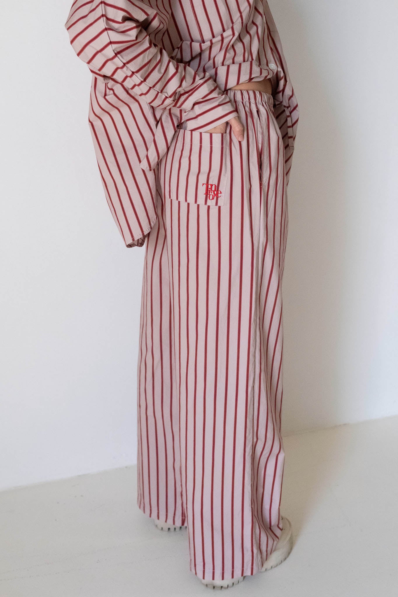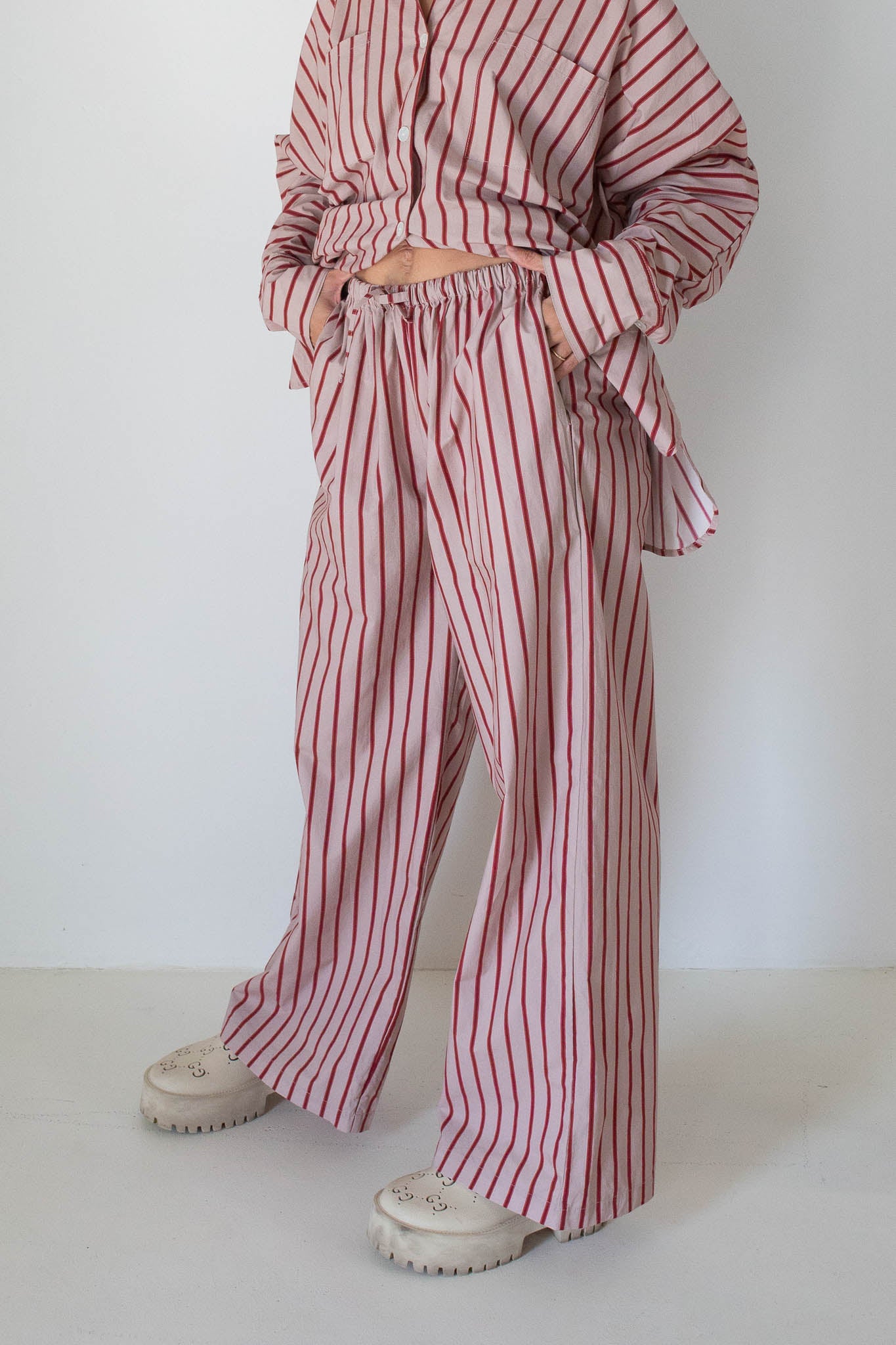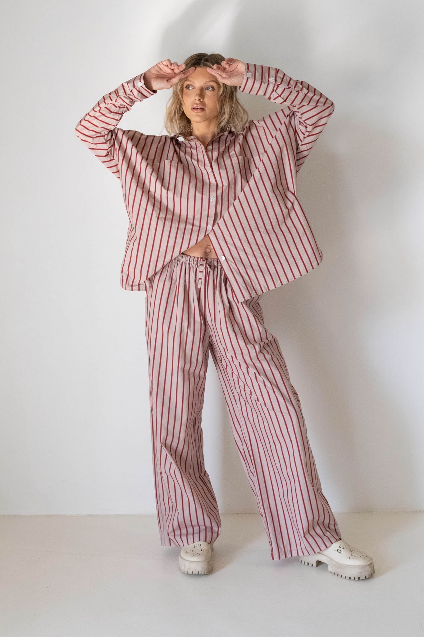 Mady is an Aus size 8 and wears a size S, styled with the shirt from our Women's Holiday Oversized Tee and the shirt from our Women's Isla Set in Pale Blush/Deep Red Stripe