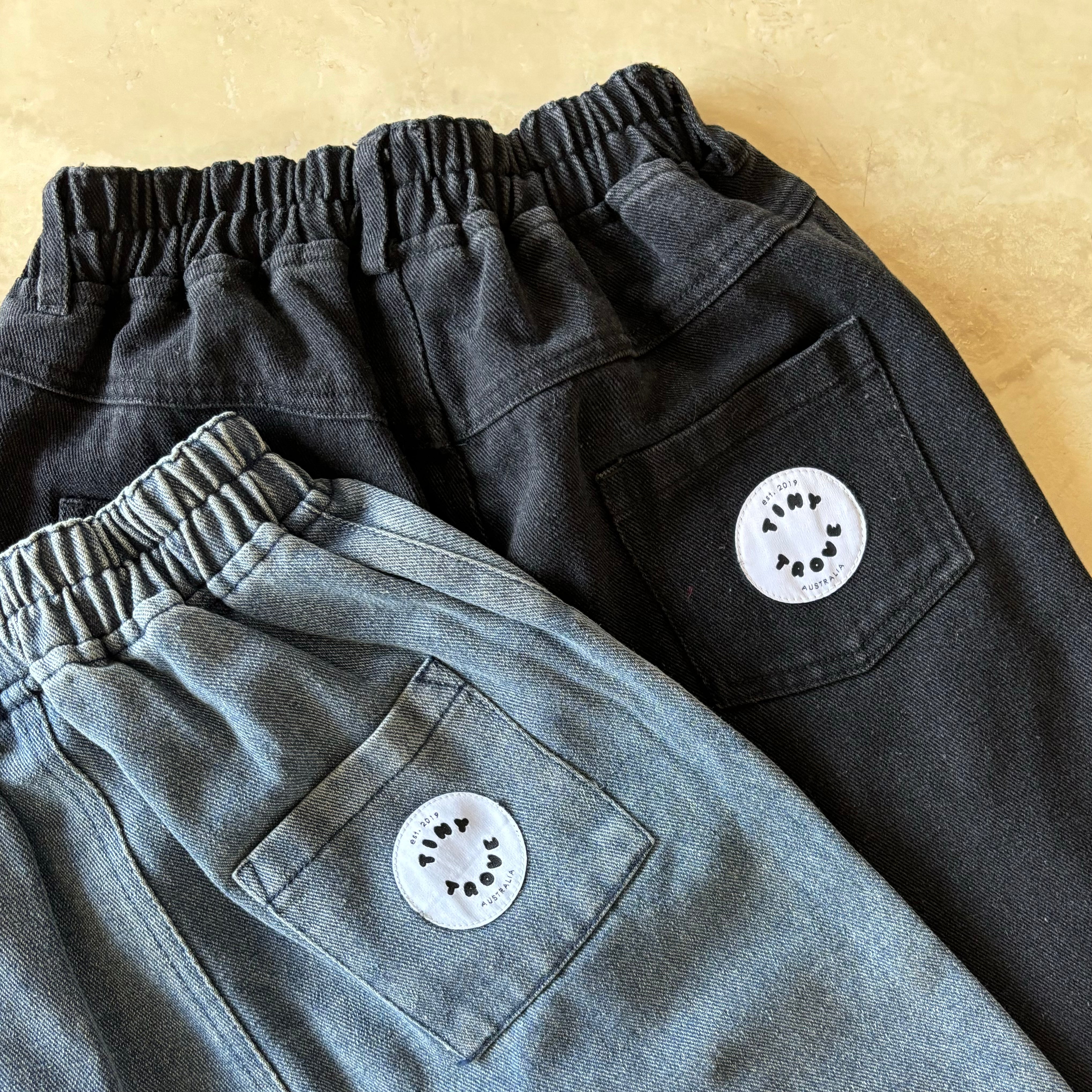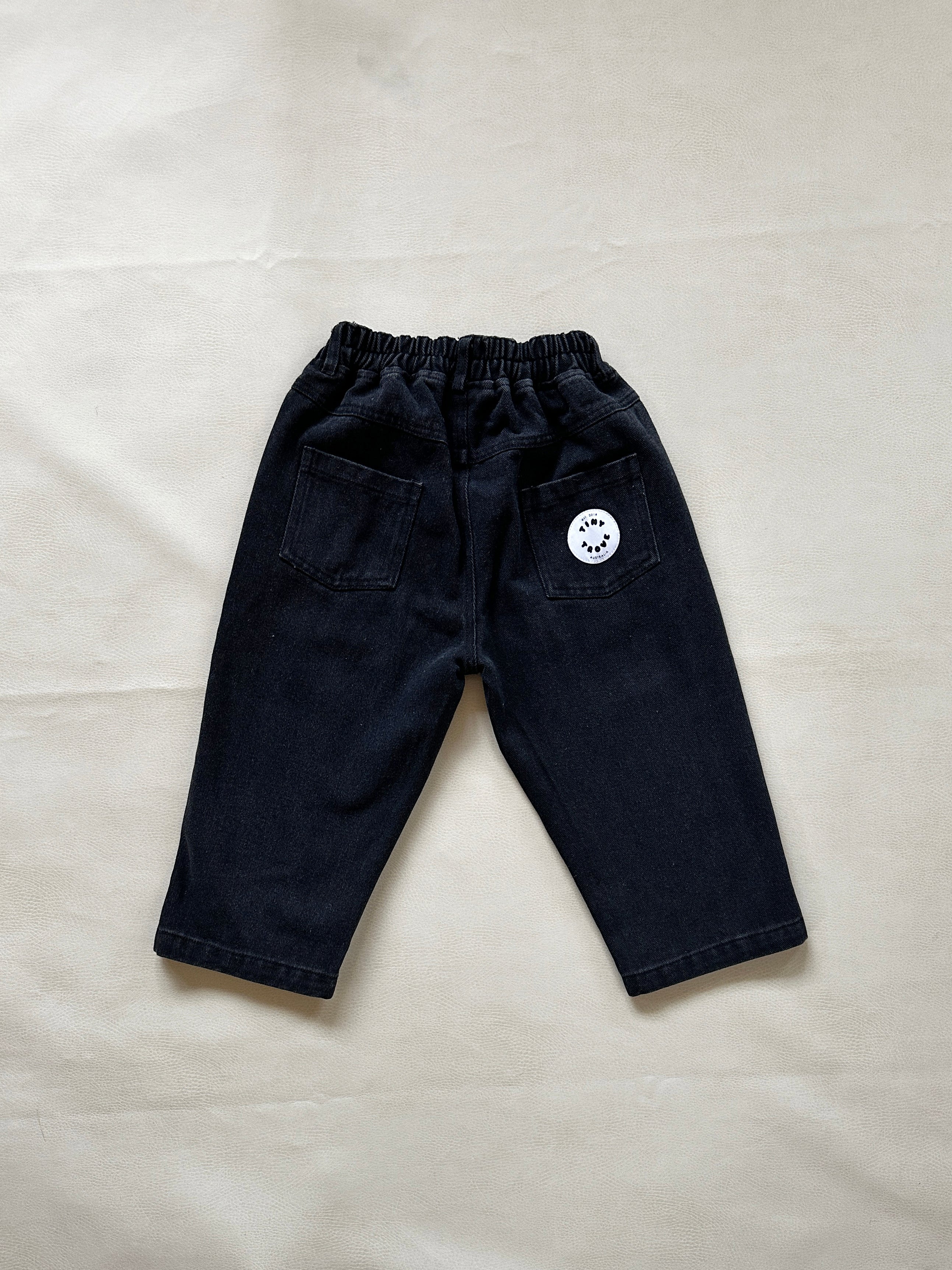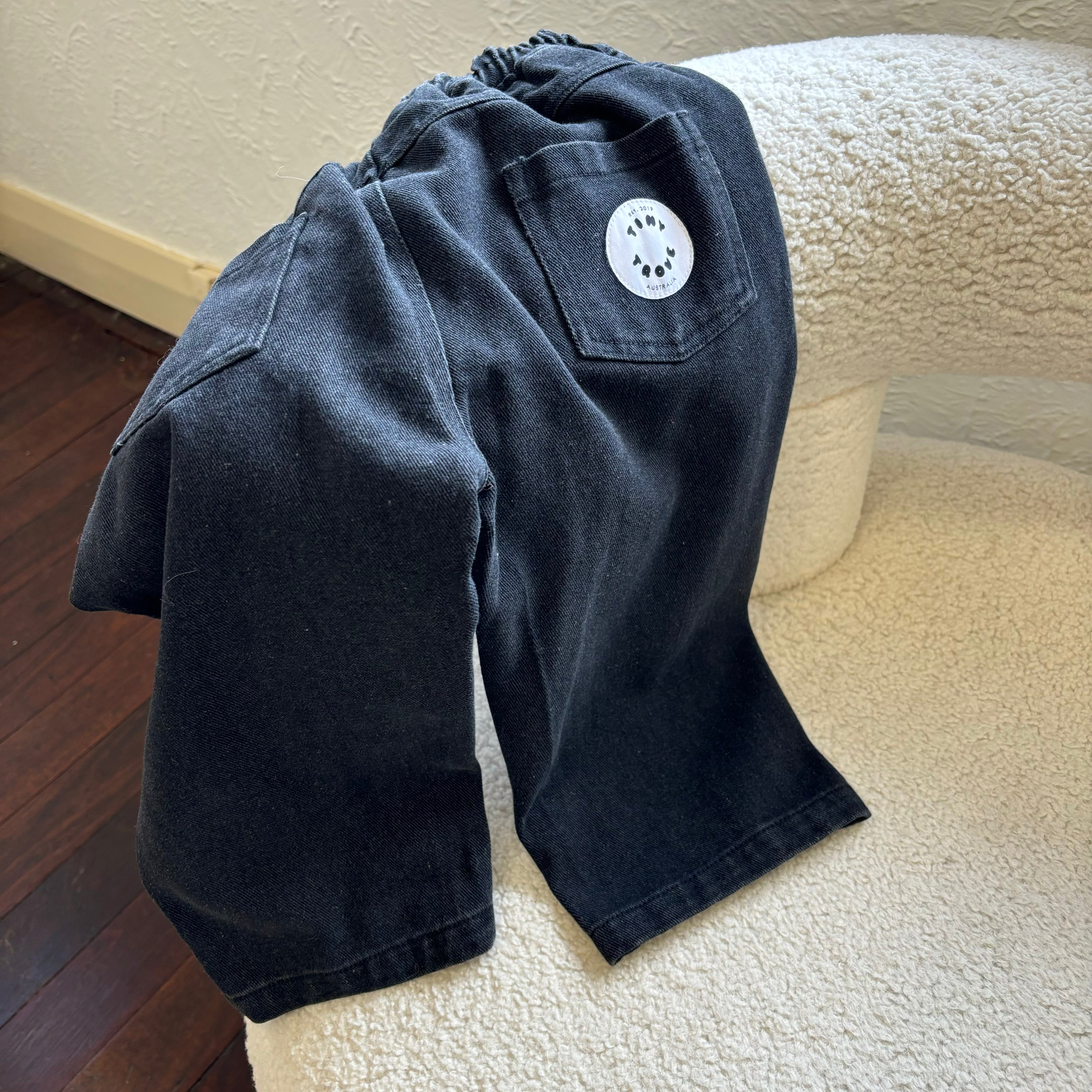 Comfortable everyday denim with a vintage wash and an elastic waistband, featuring a tiny trove patch on back right pocket