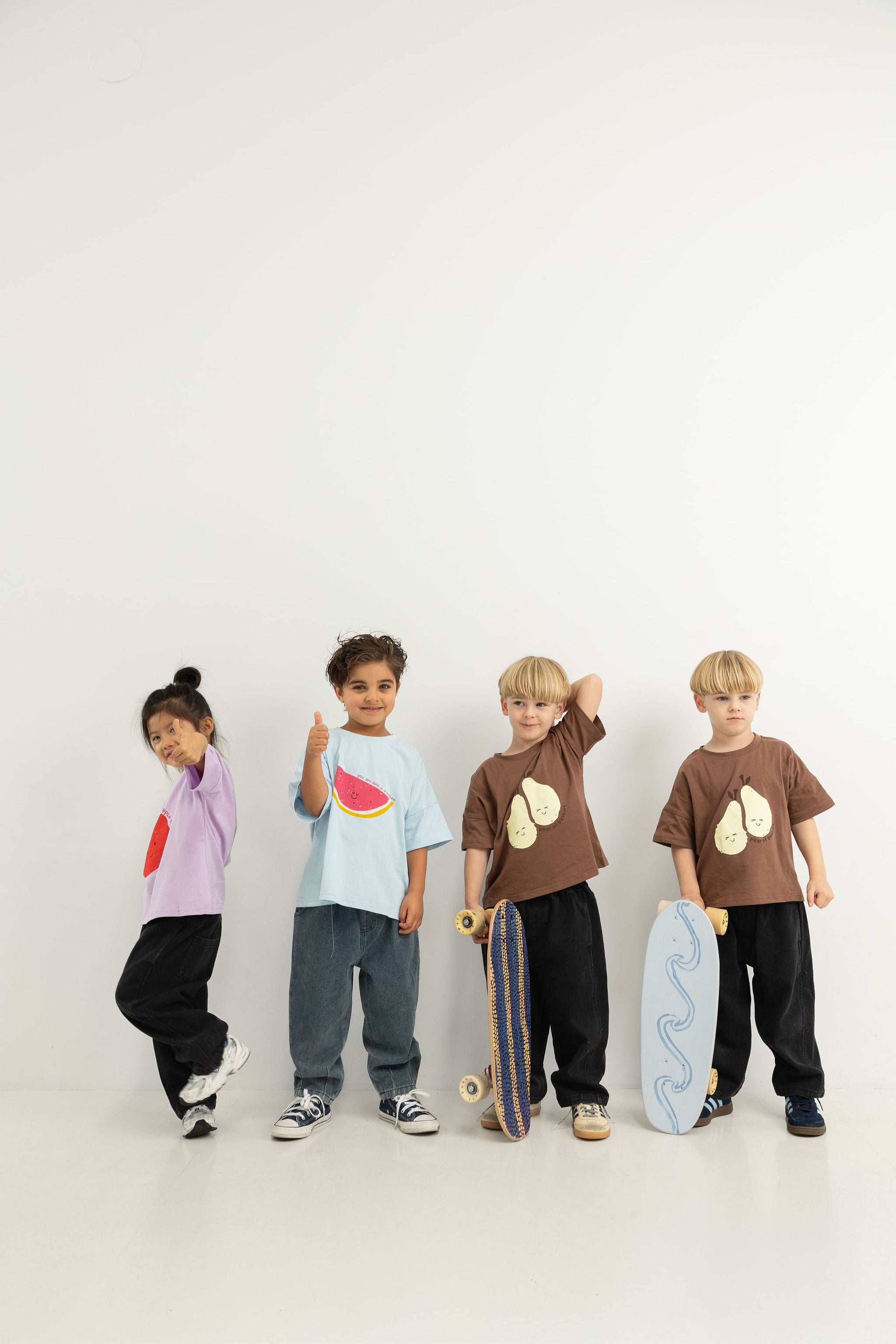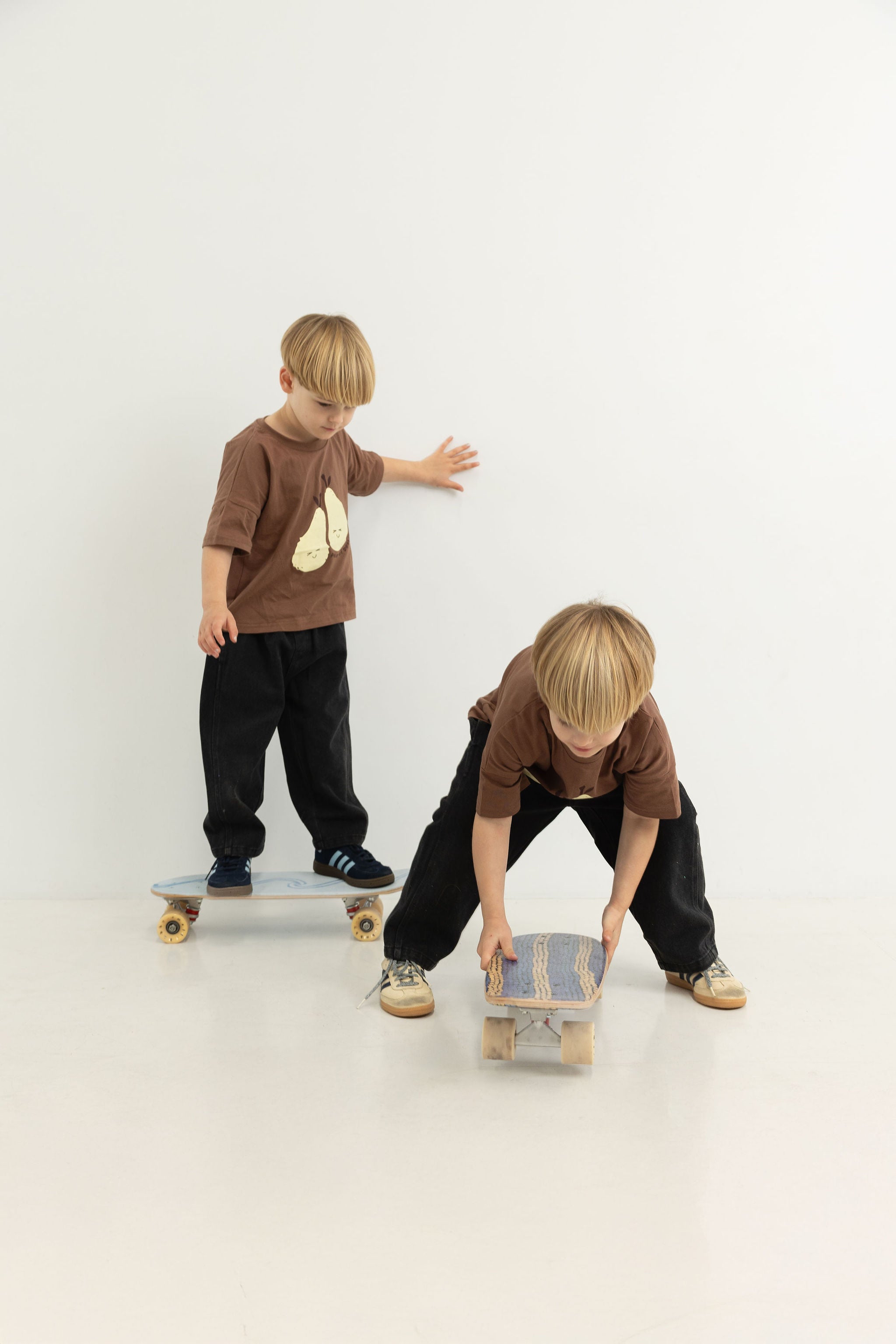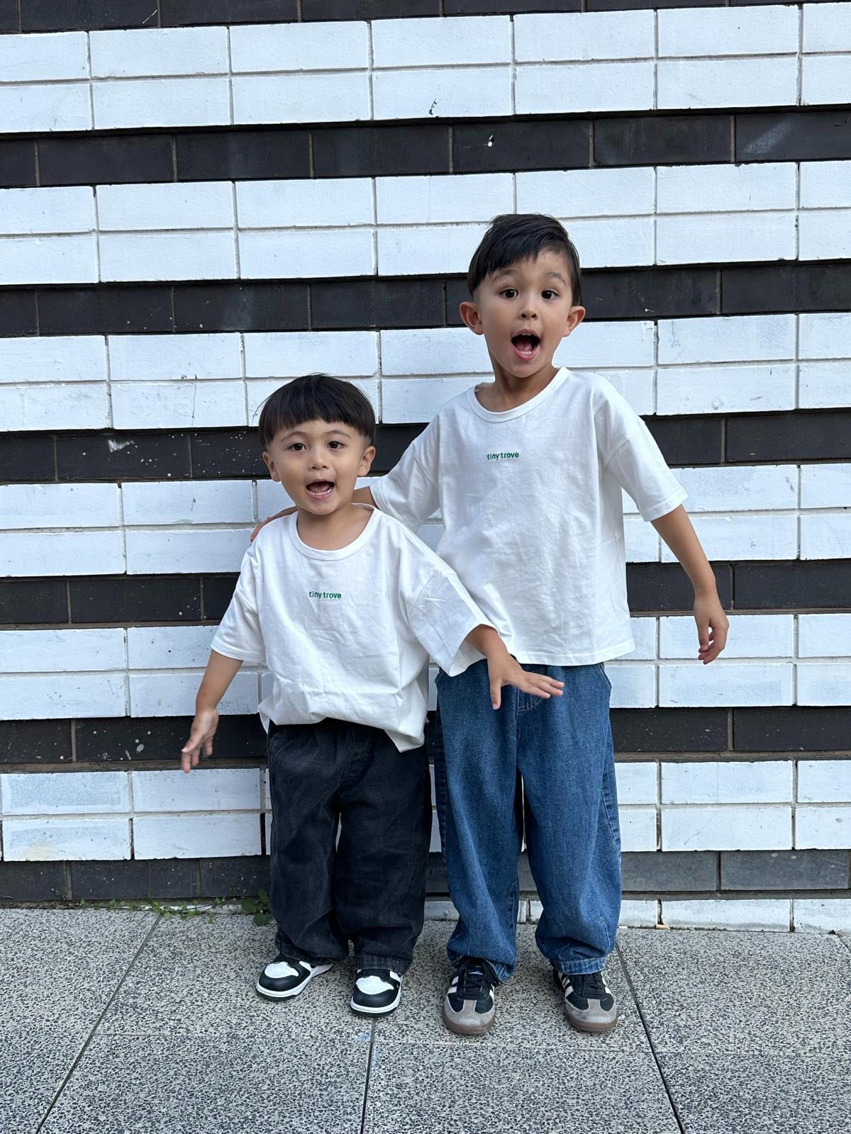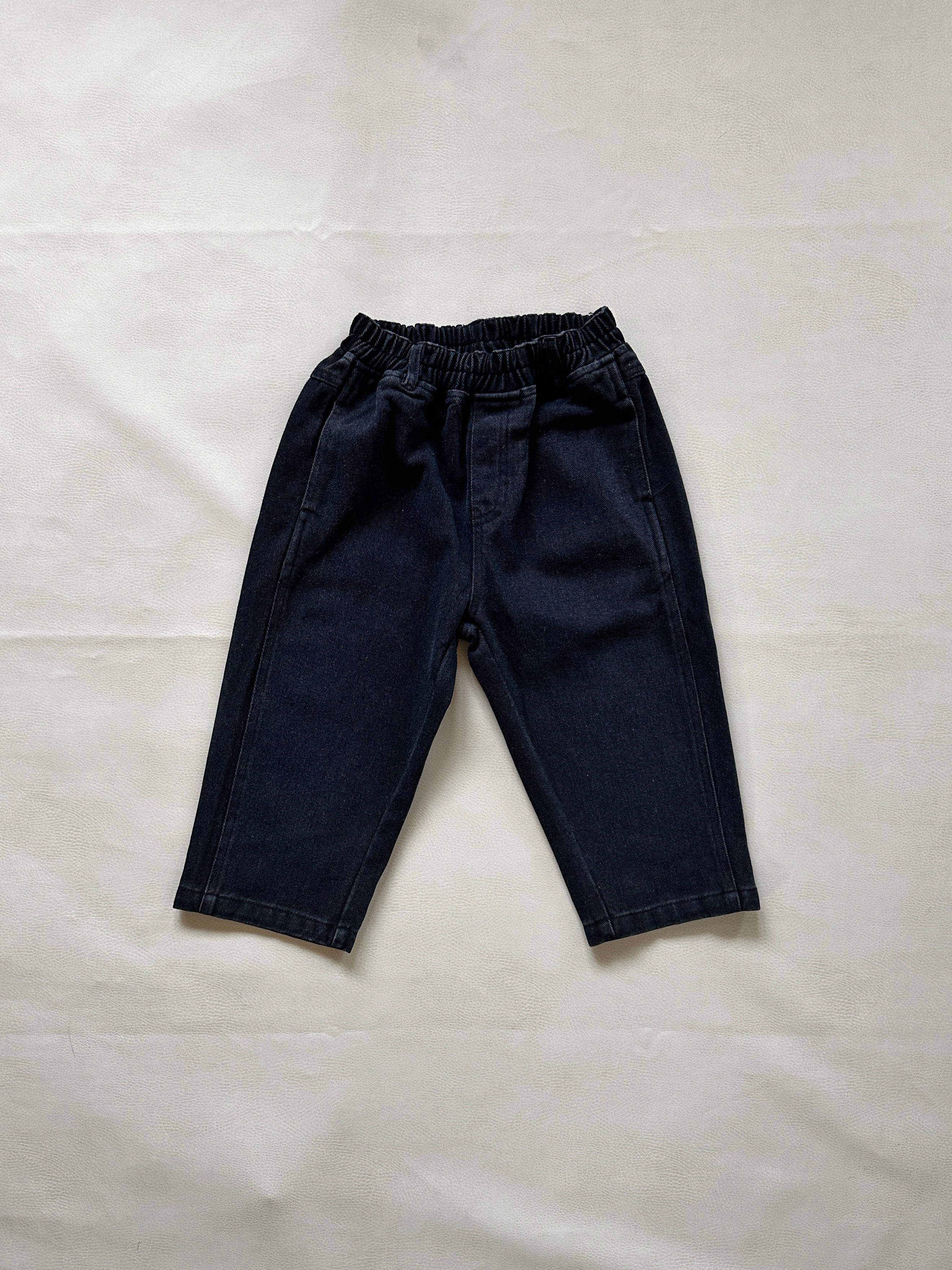 Comfortable everyday denim with a vintage wash and an elastic waistband, featuring a tiny trove patch on back right pocket