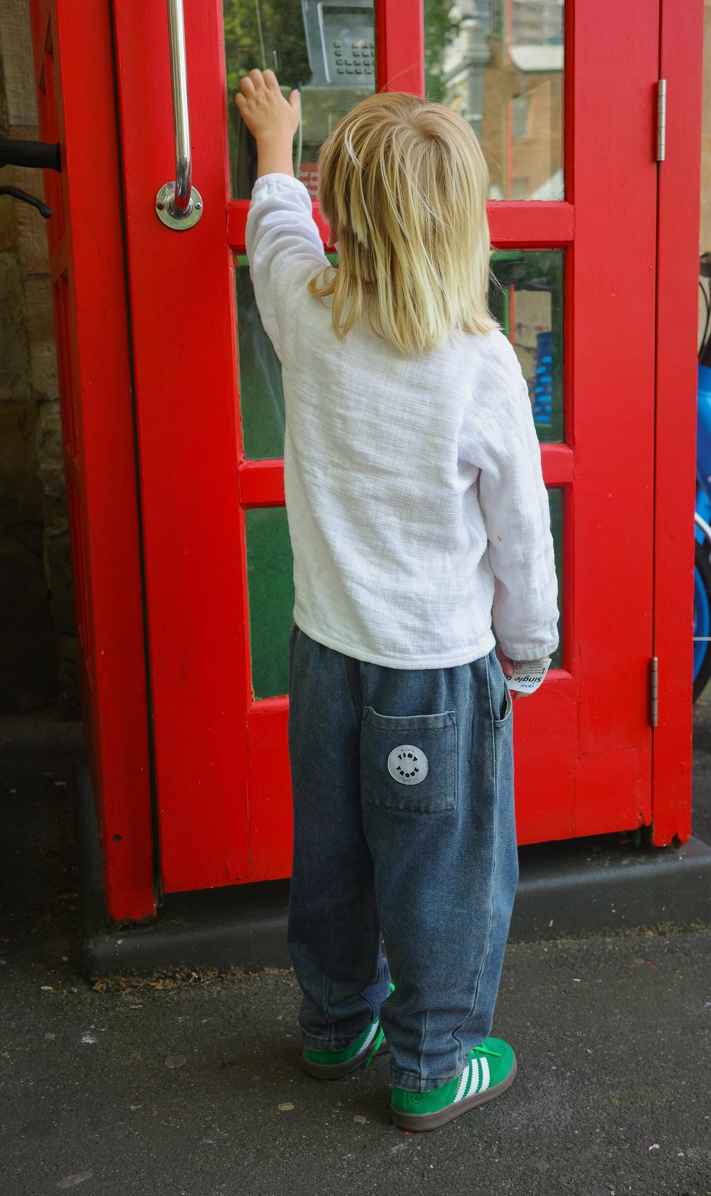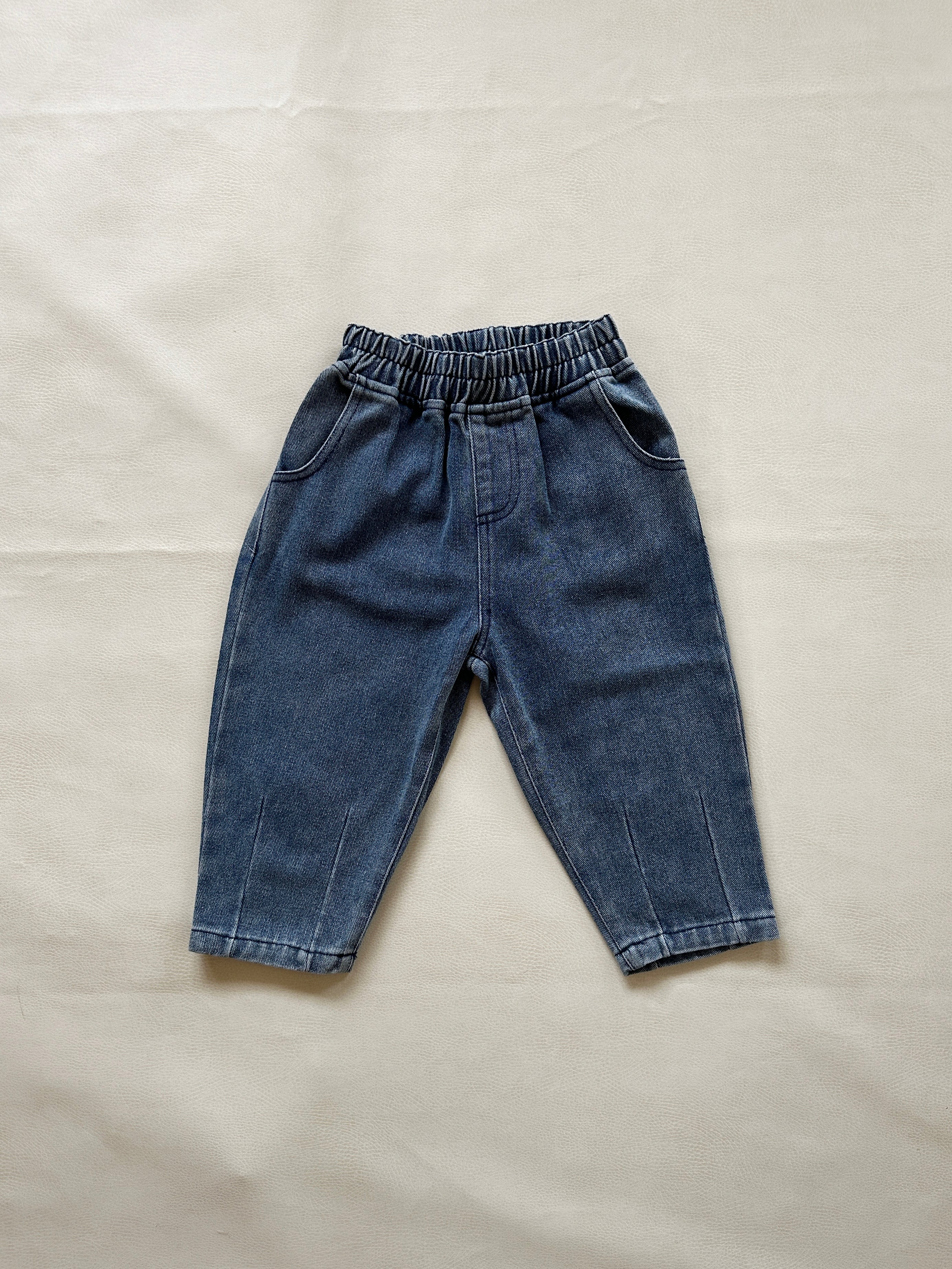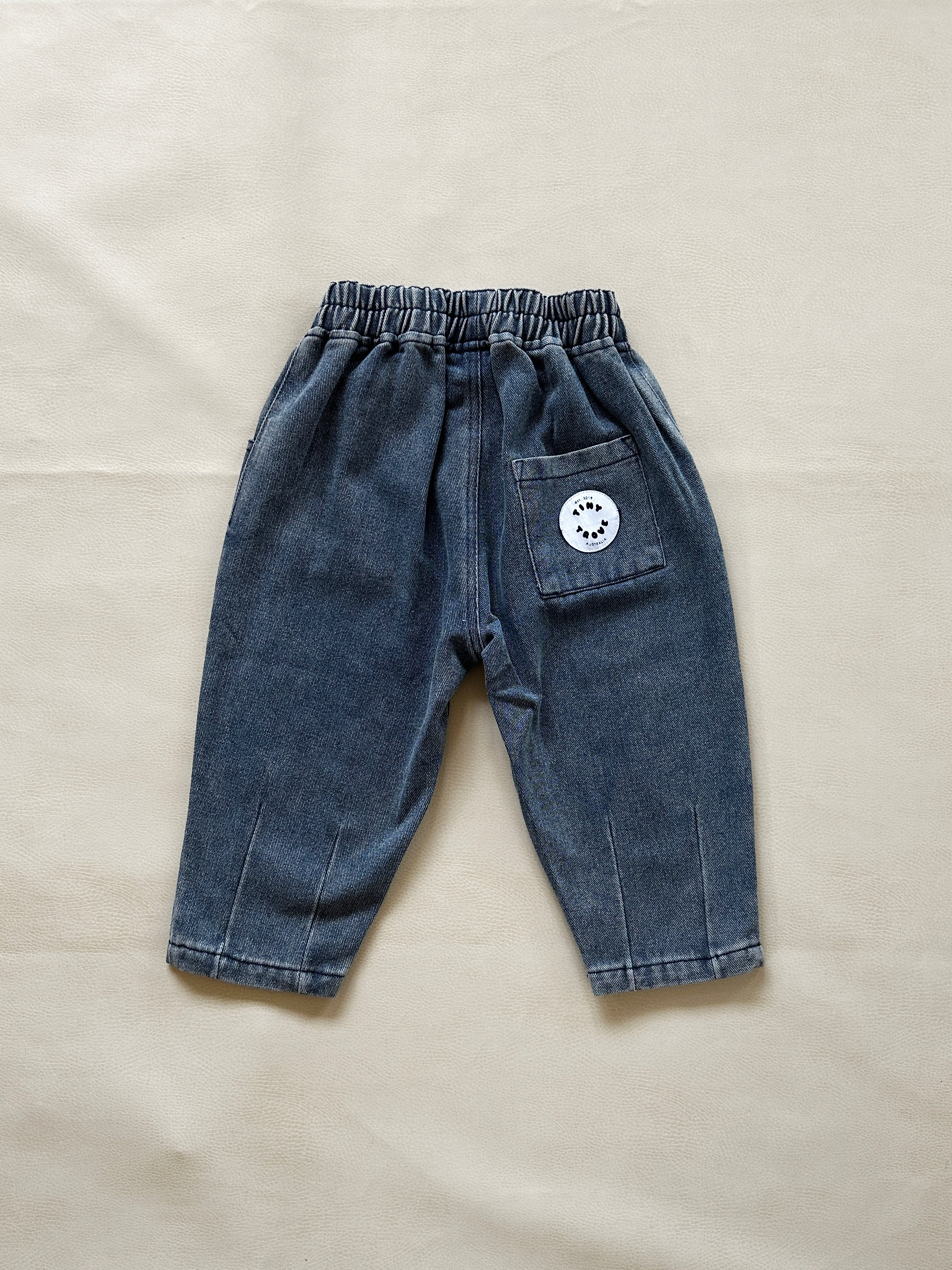 Comfortable everyday denim with a blue mid-wash and an elastic waistband, featuring a limited-edition tiny trove patch on back right pocket