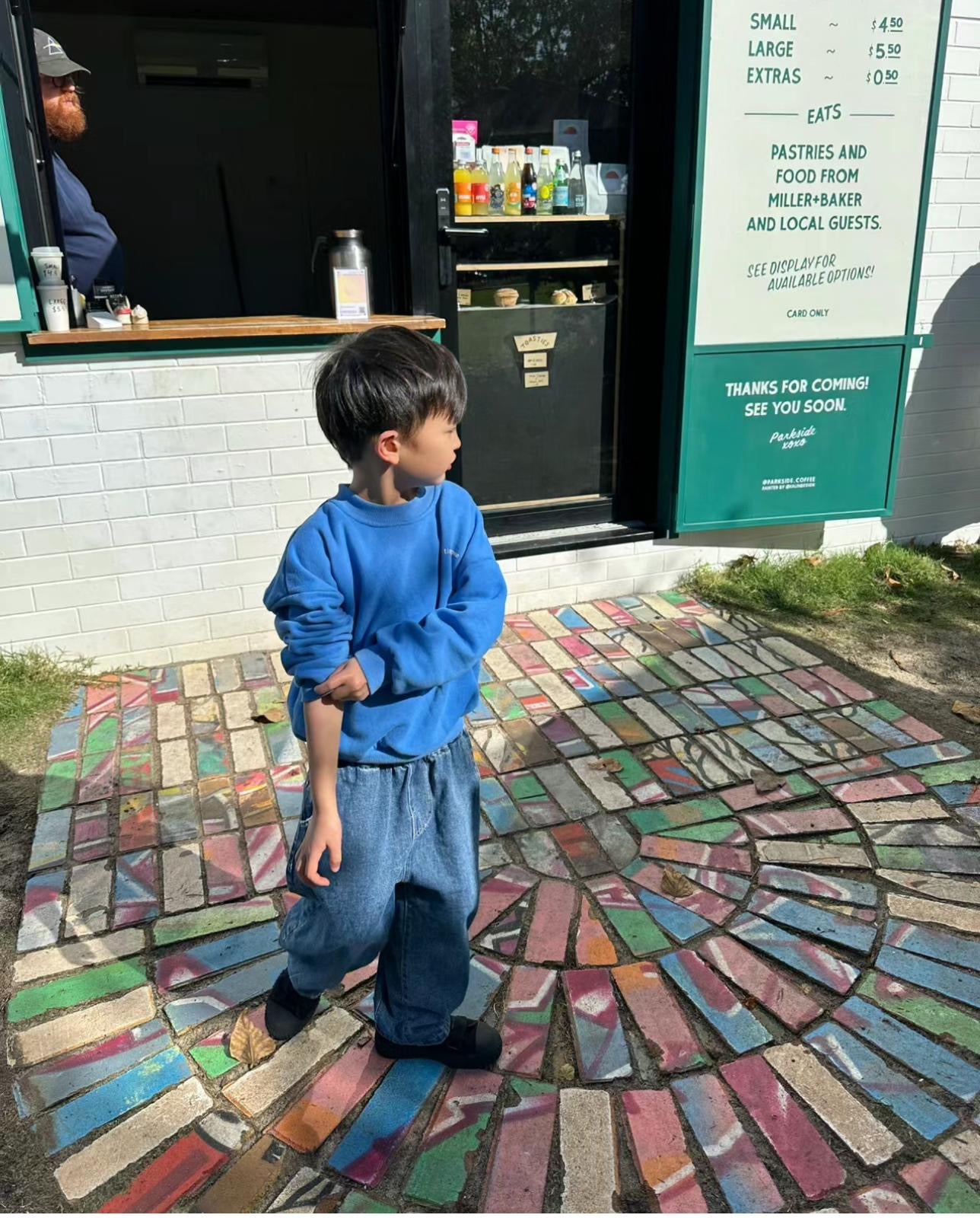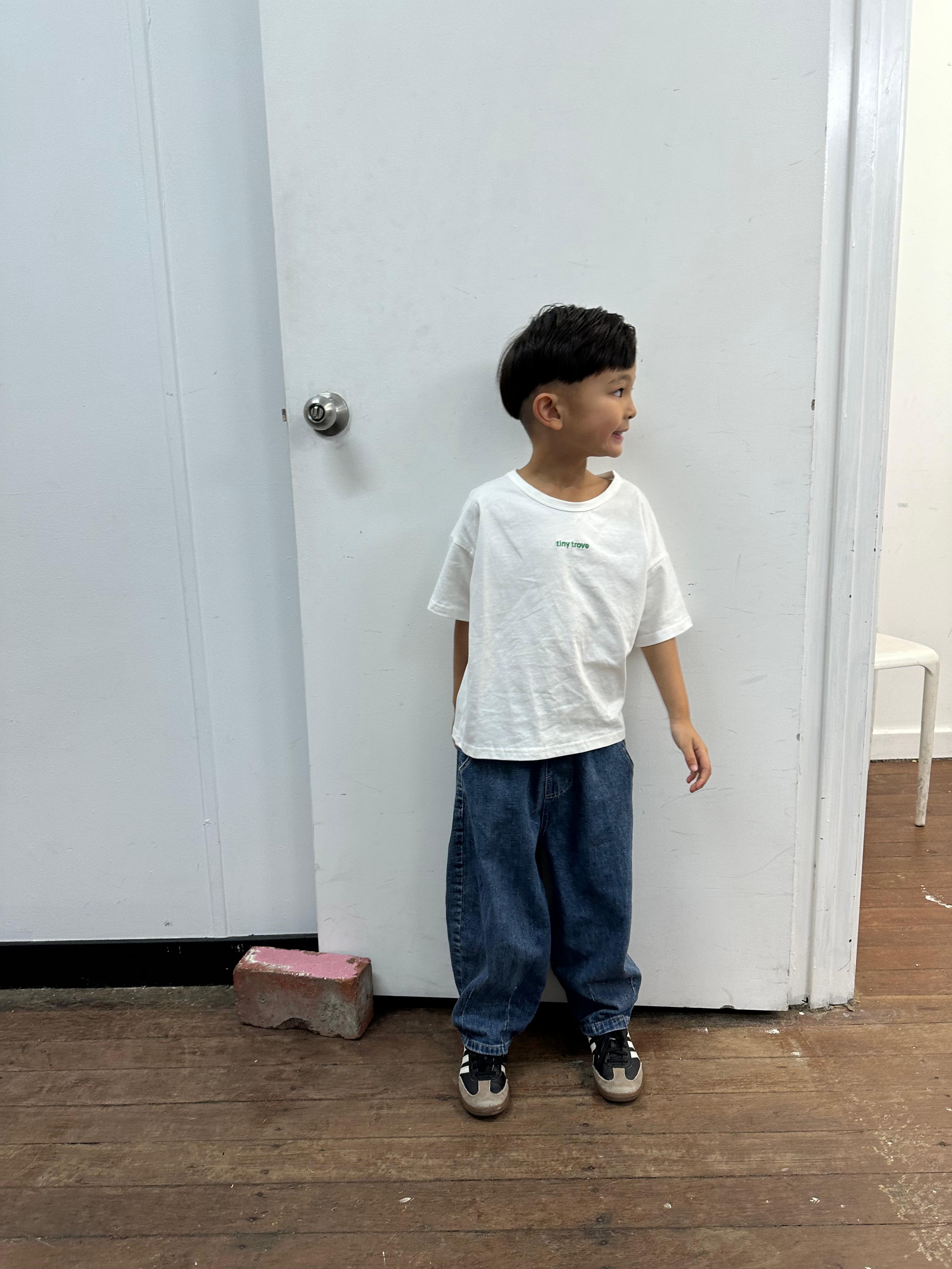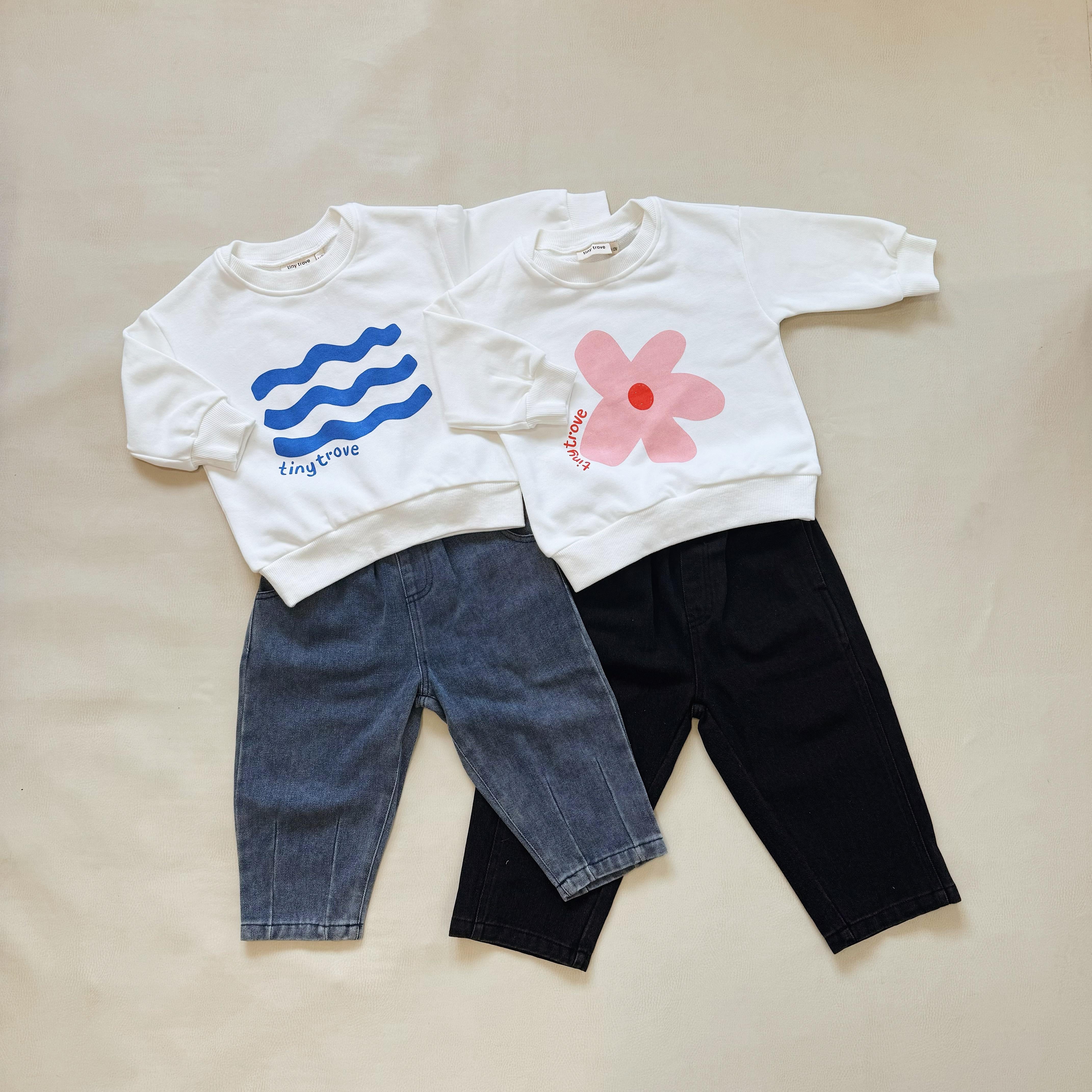 Comfortable everyday denim with a blue mid-wash and an elastic waistband, featuring a limited-edition tiny trove patch on back right pocket