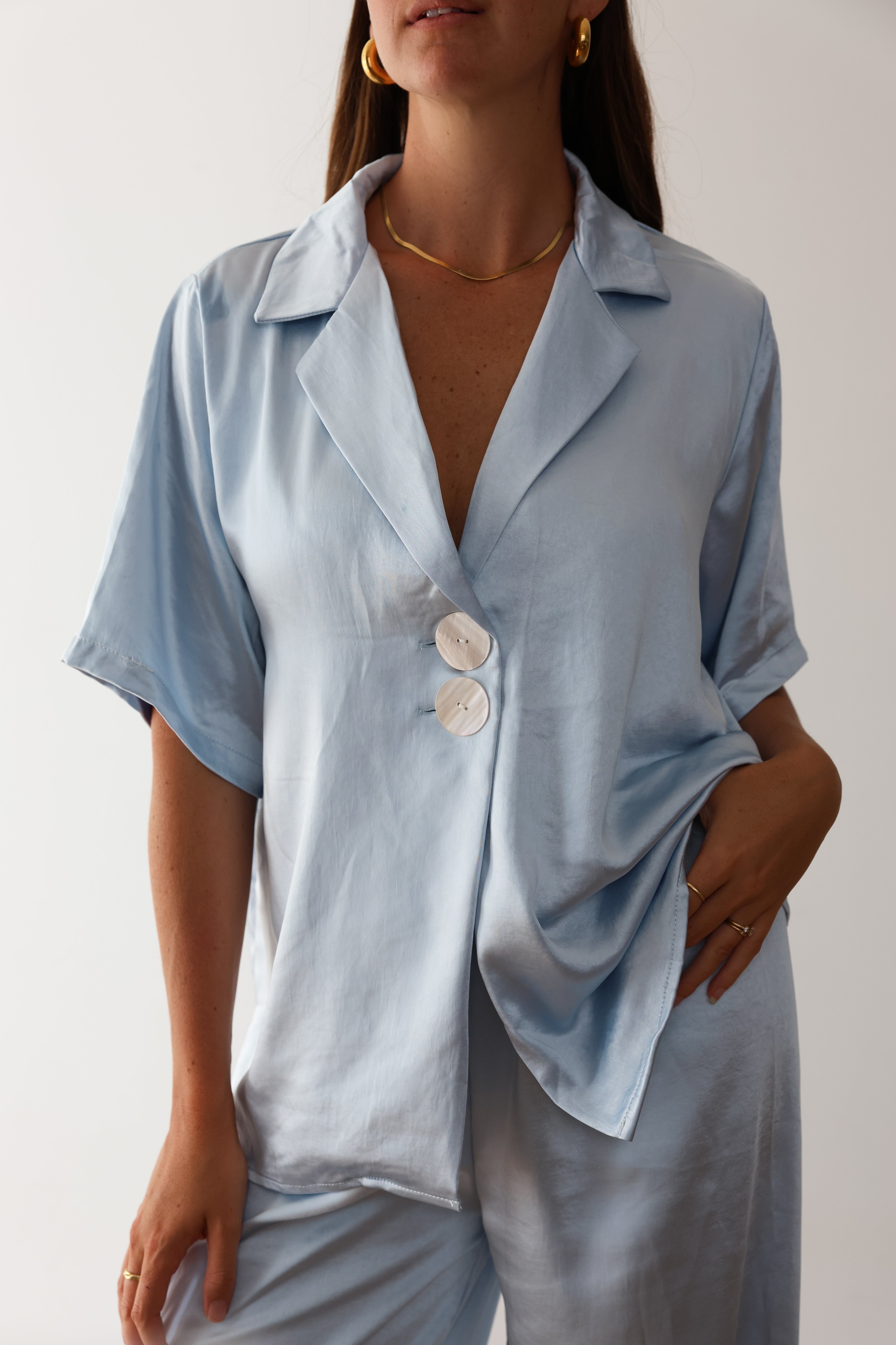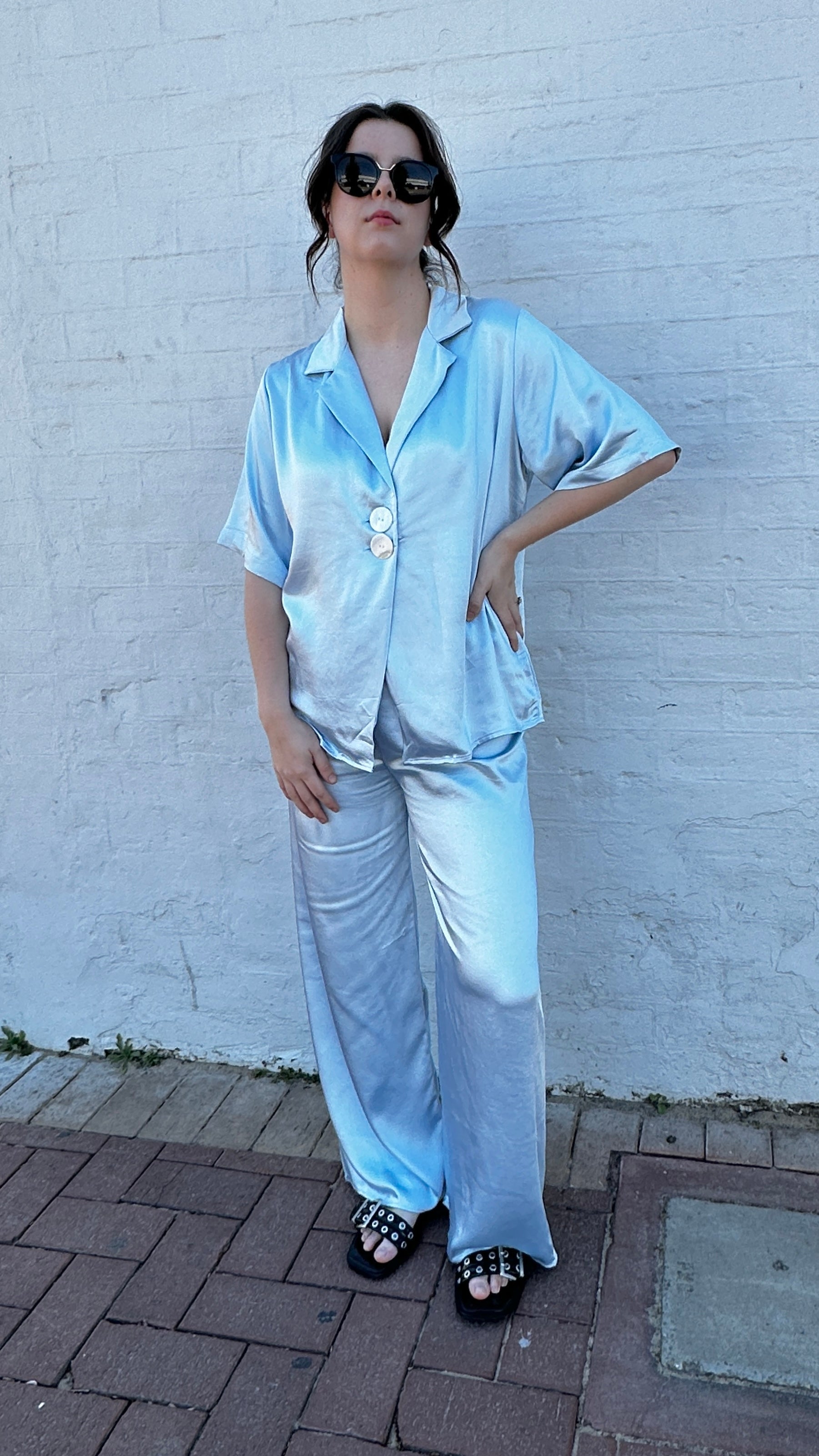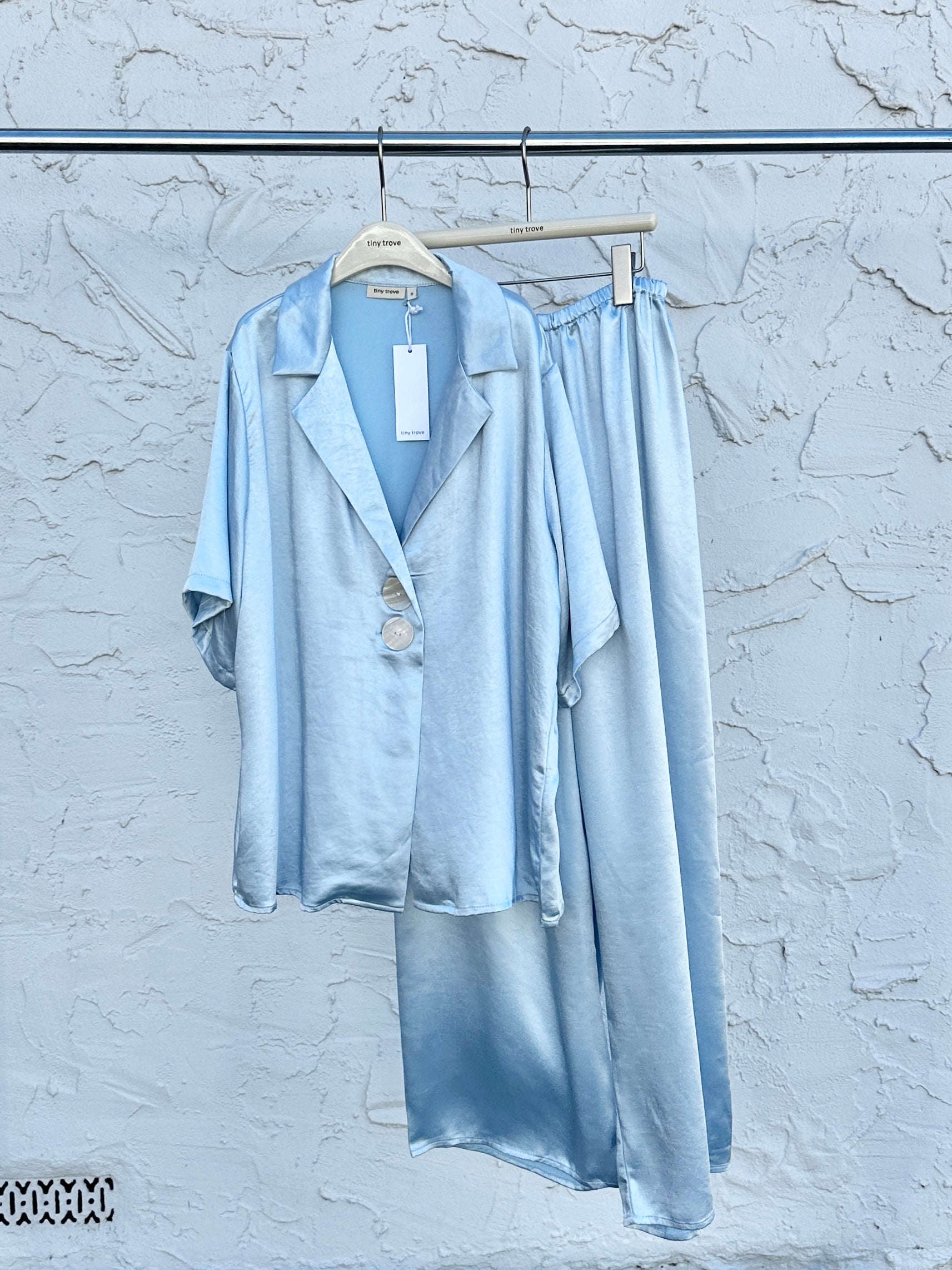 This set includes a minimal but stylish shirt and pants that deserves a place in every wardrobe. The shirt features a soft collar and lapel drawn together by two accent shell buttons. The pants feature an elasticated waistband for comfort and a slim straight leg, and have a silky premium feel that drapes effortlessly against the leg.