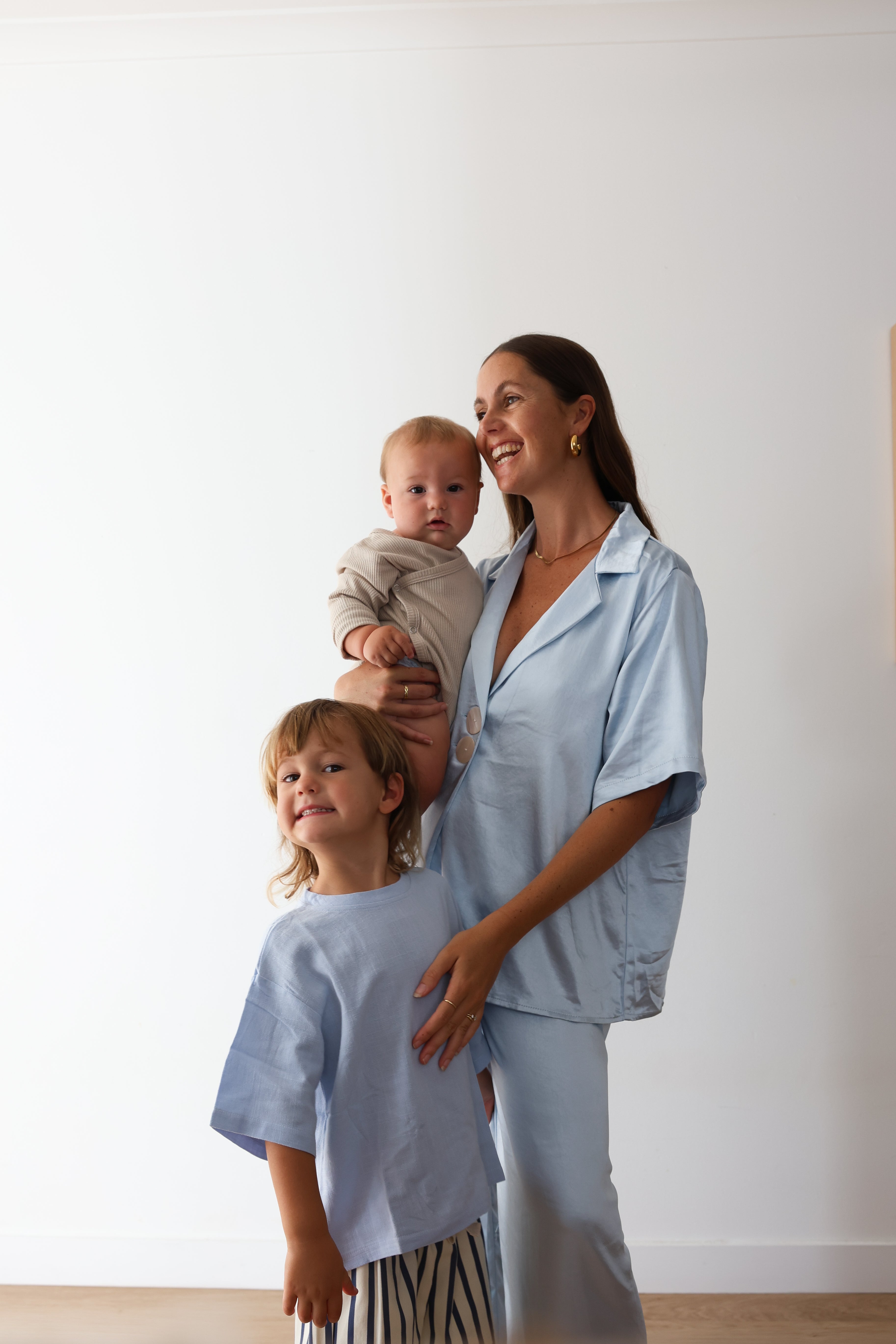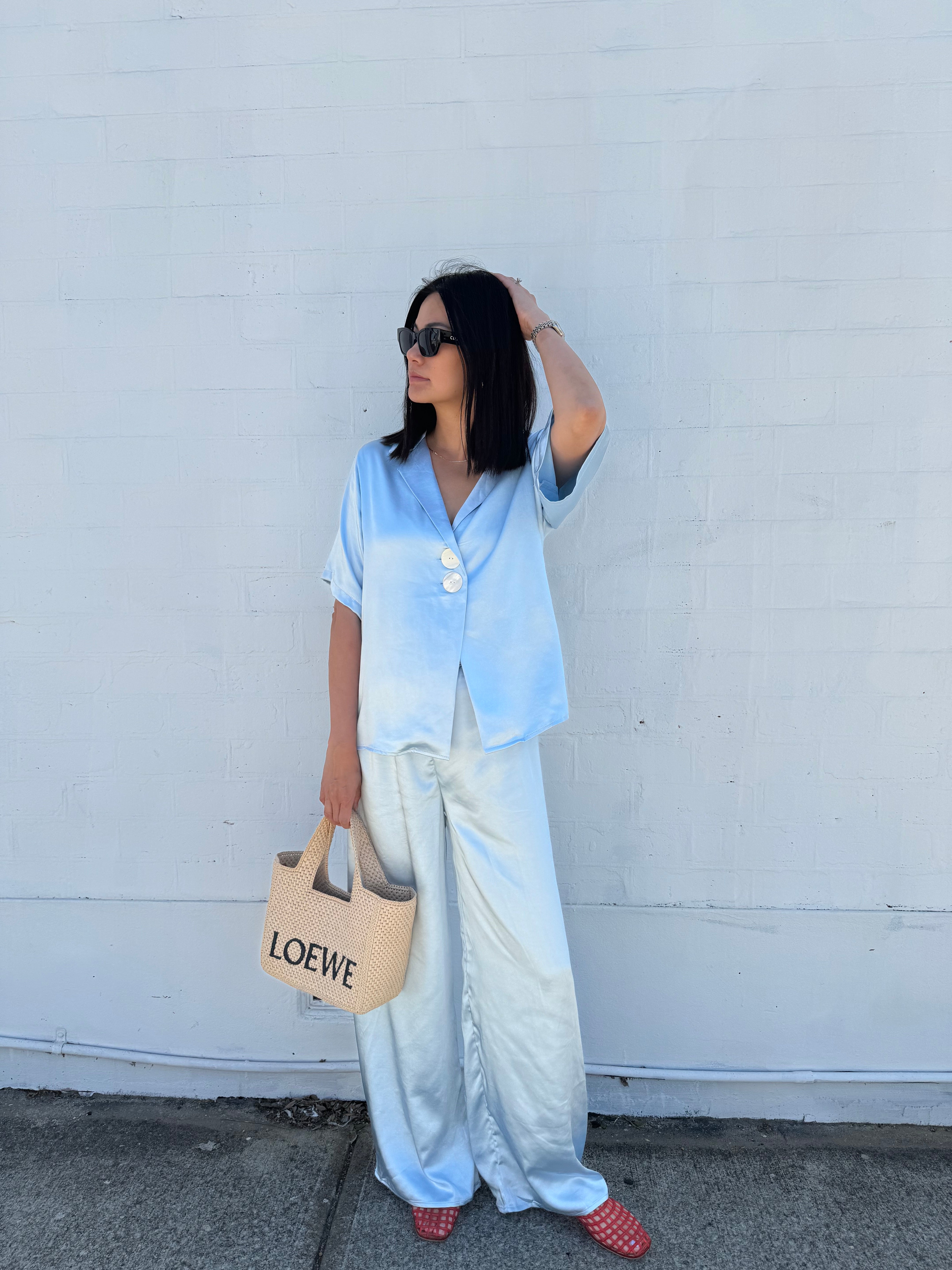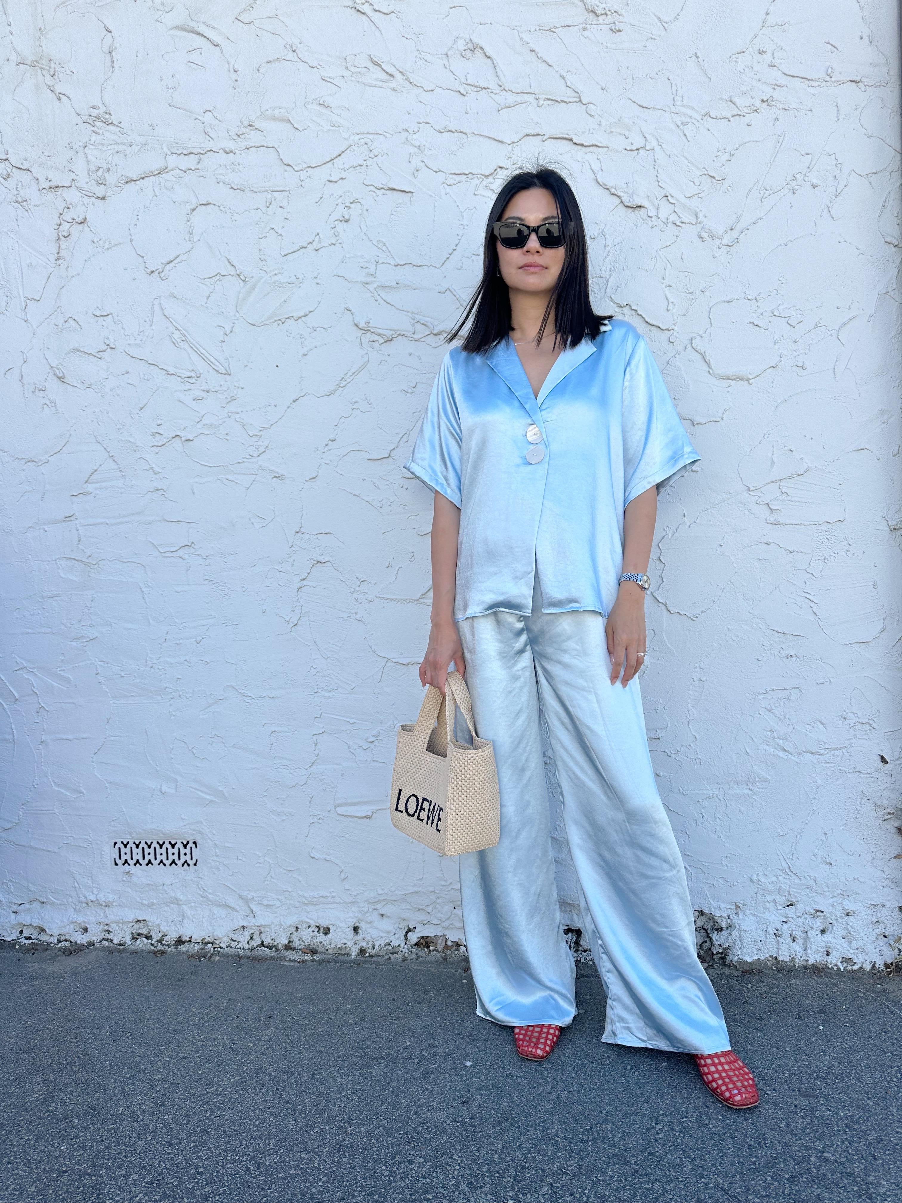 This set includes a minimal but stylish shirt and pants that deserves a place in every wardrobe. The shirt features a soft collar and lapel drawn together by two accent shell buttons. The pants feature an elasticated waistband for comfort and a slim straight leg, and have a silky premium feel that drapes effortlessly against the leg.