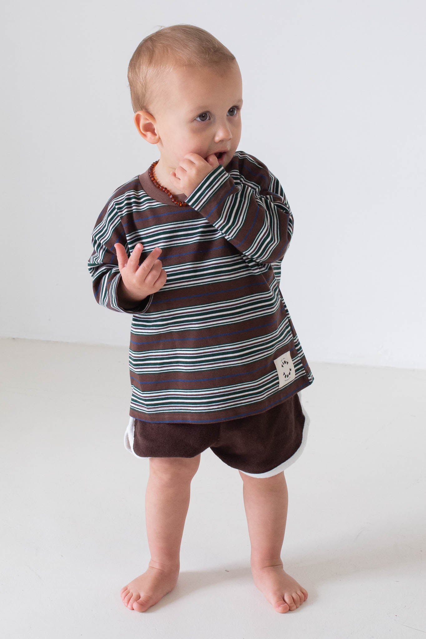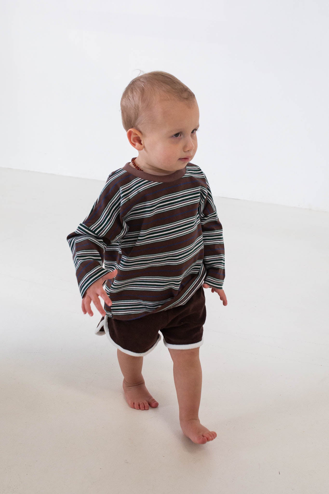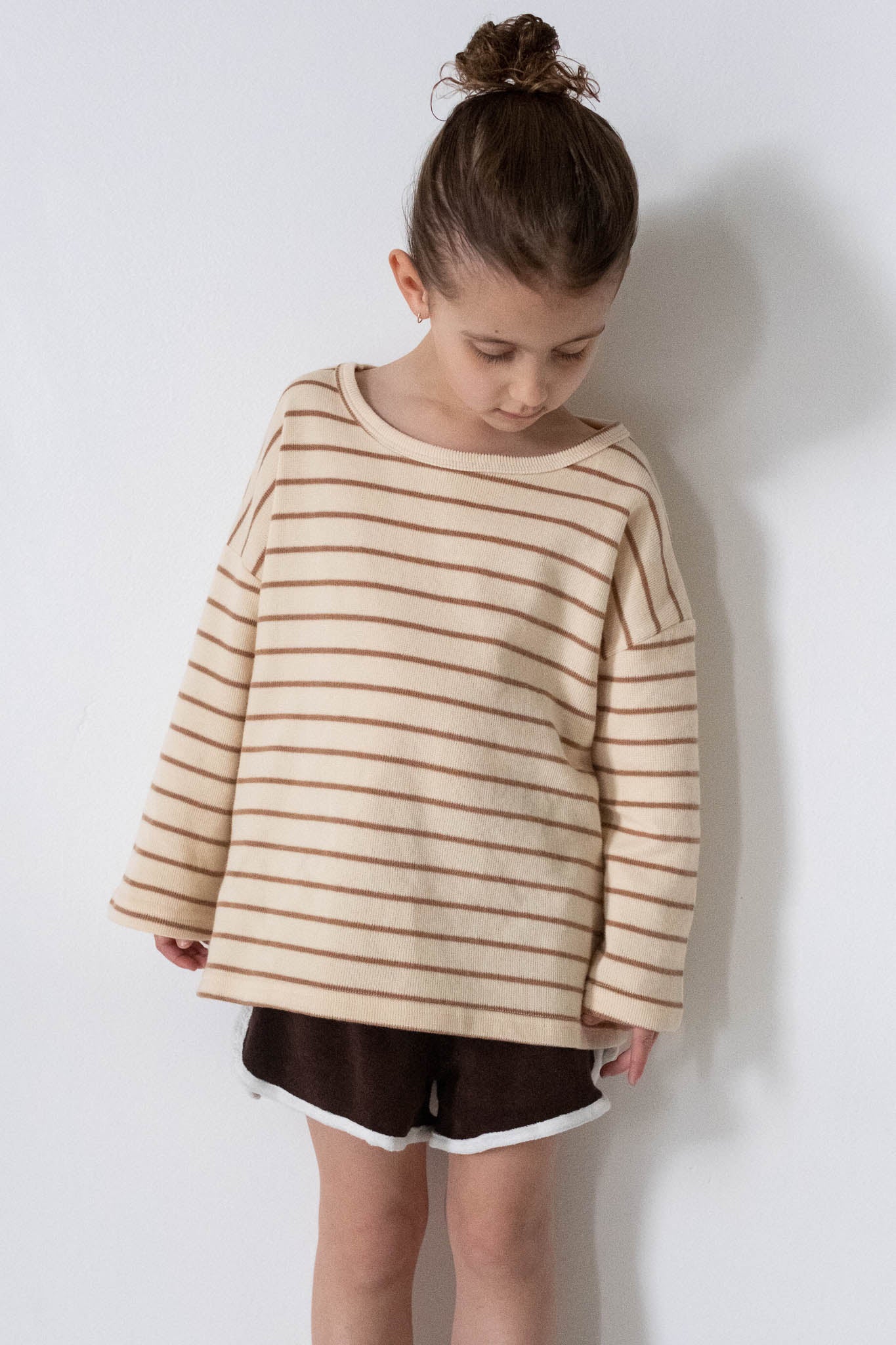 Sol is 18months and wears a size 2Y (styled with our Penn Long Sleeve Stripe Cotton Tee, coming soon!)