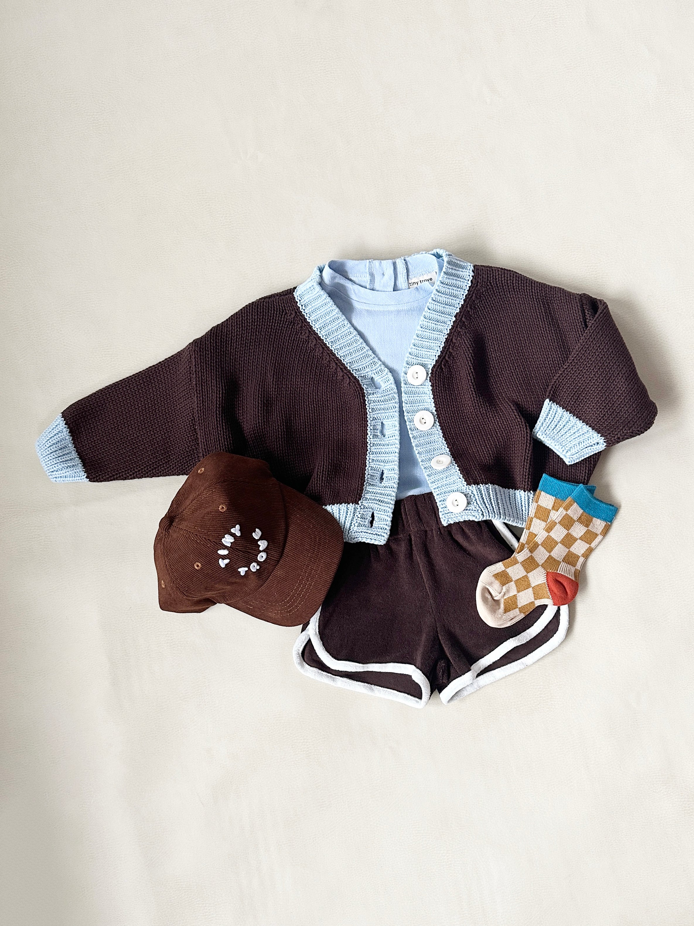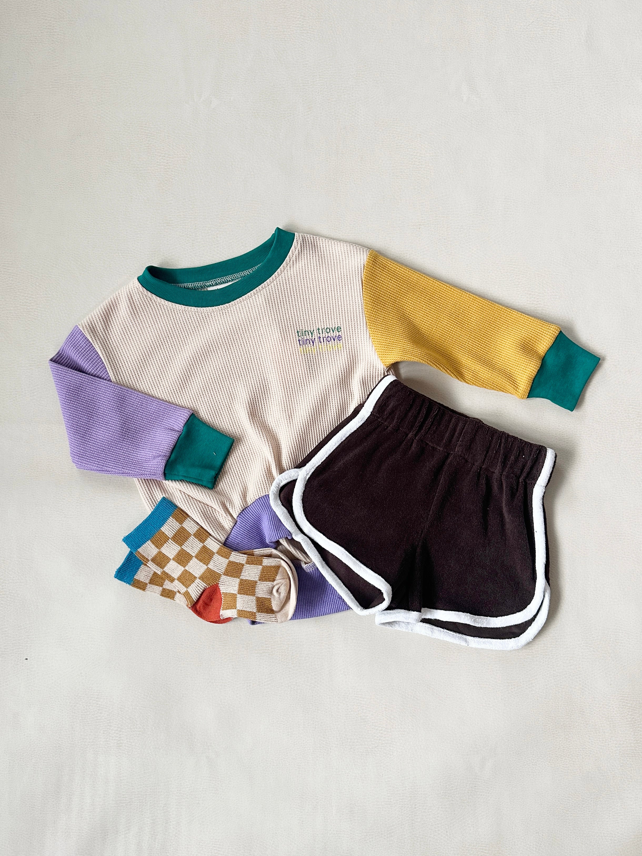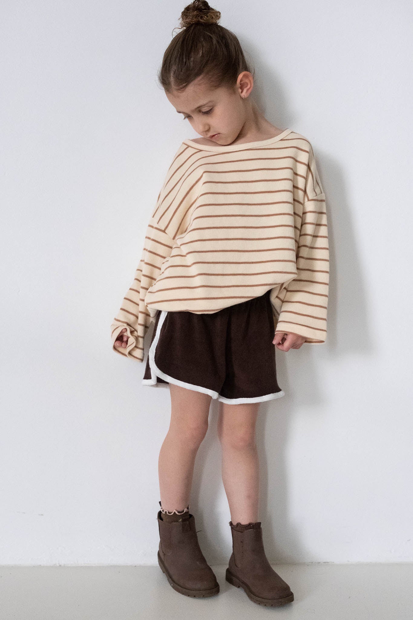 Sol is 18months and wears a size 2Y (styled with our Penn Long Sleeve Stripe Cotton Tee, coming soon!)