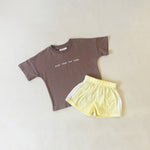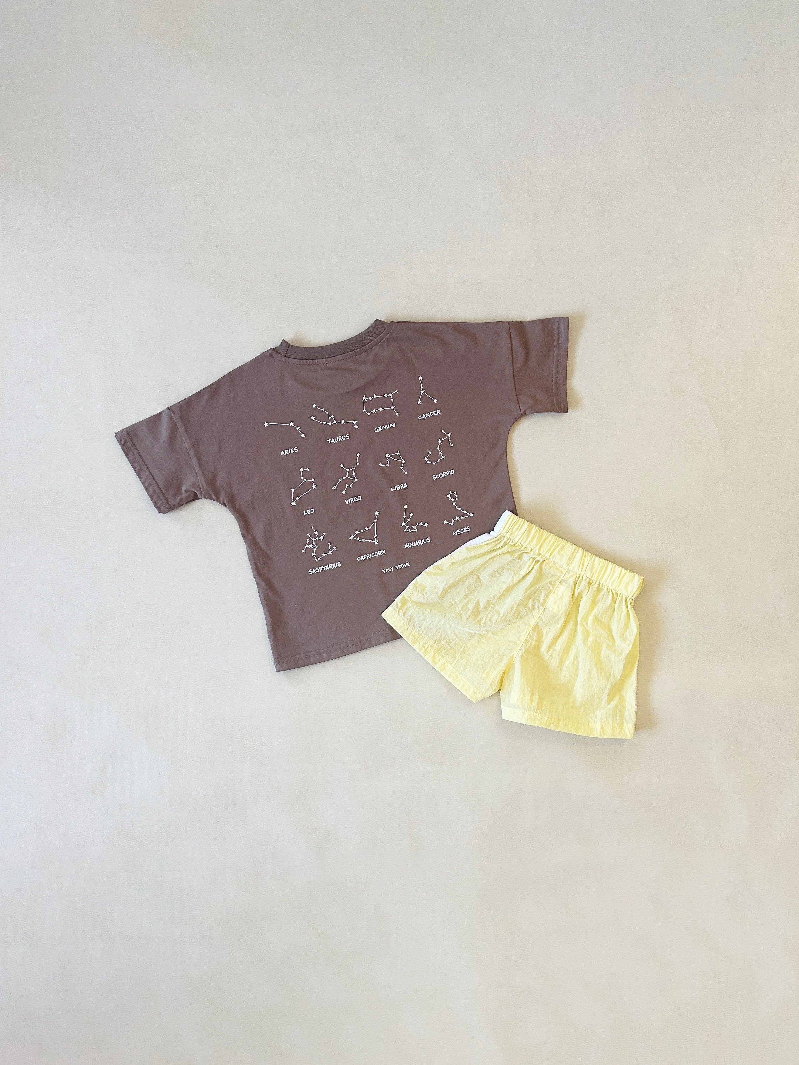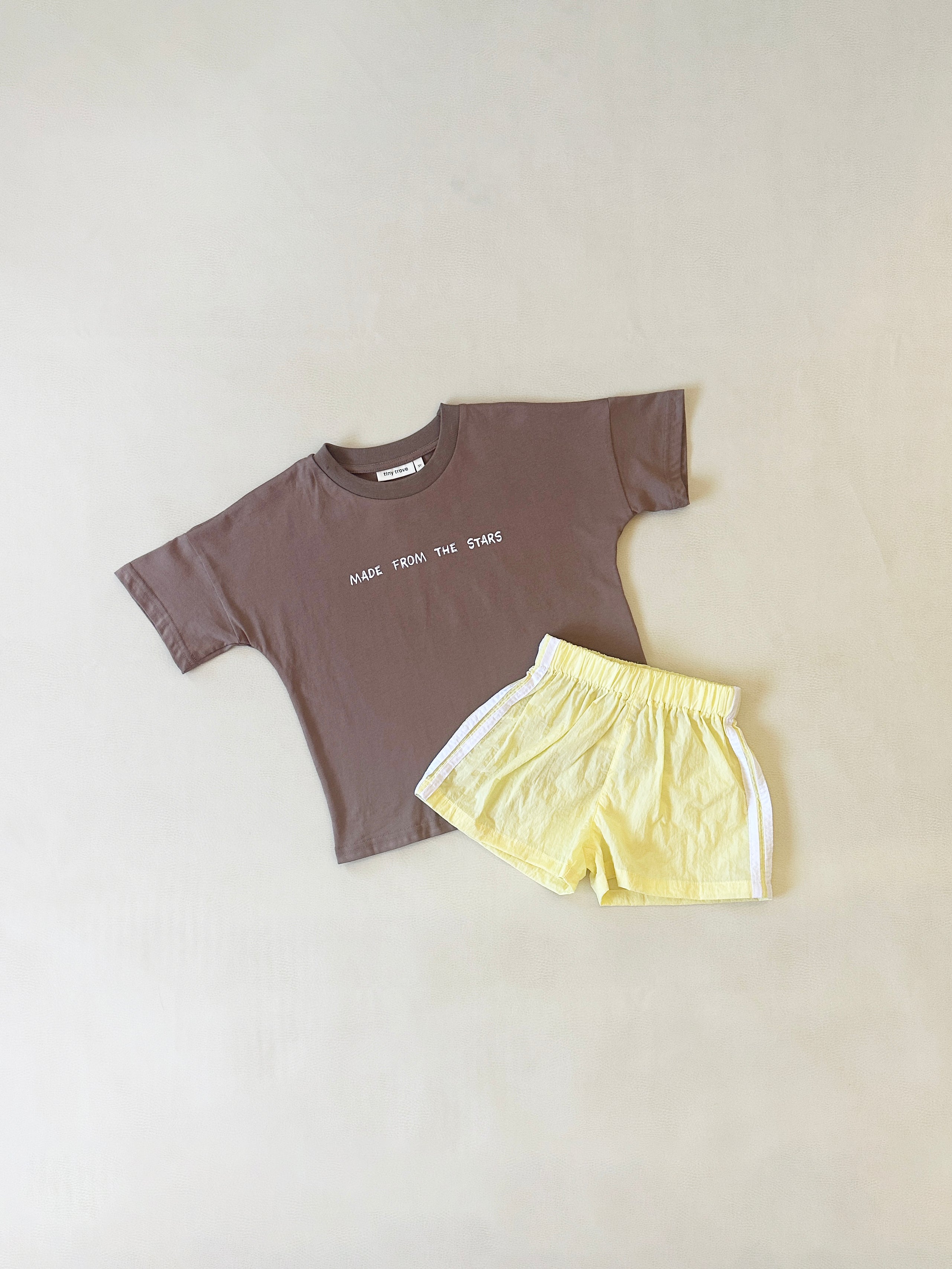 Please note, this listing is for the SET. You can still buy the individual items here: Stars Relaxed Tee in Mocha/White and Romeo Waterproof Shorts in Butter Yellow.