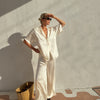 This set includes a minimal but stylish shirt and pants that deserves a place in every wardrobe. The shirt features a soft collar and lapel drawn together by two accent shell buttons. The pants feature an elasticated waistband for comfort and a slim straight leg, and have a silky premium feel that drapes effortlessly against the leg.