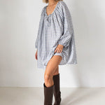 In a timeless blue, white, and grey check, it’s the kind of versatile piece you can dress up or down - perfect with sandals, sneakers (or even a boot!).