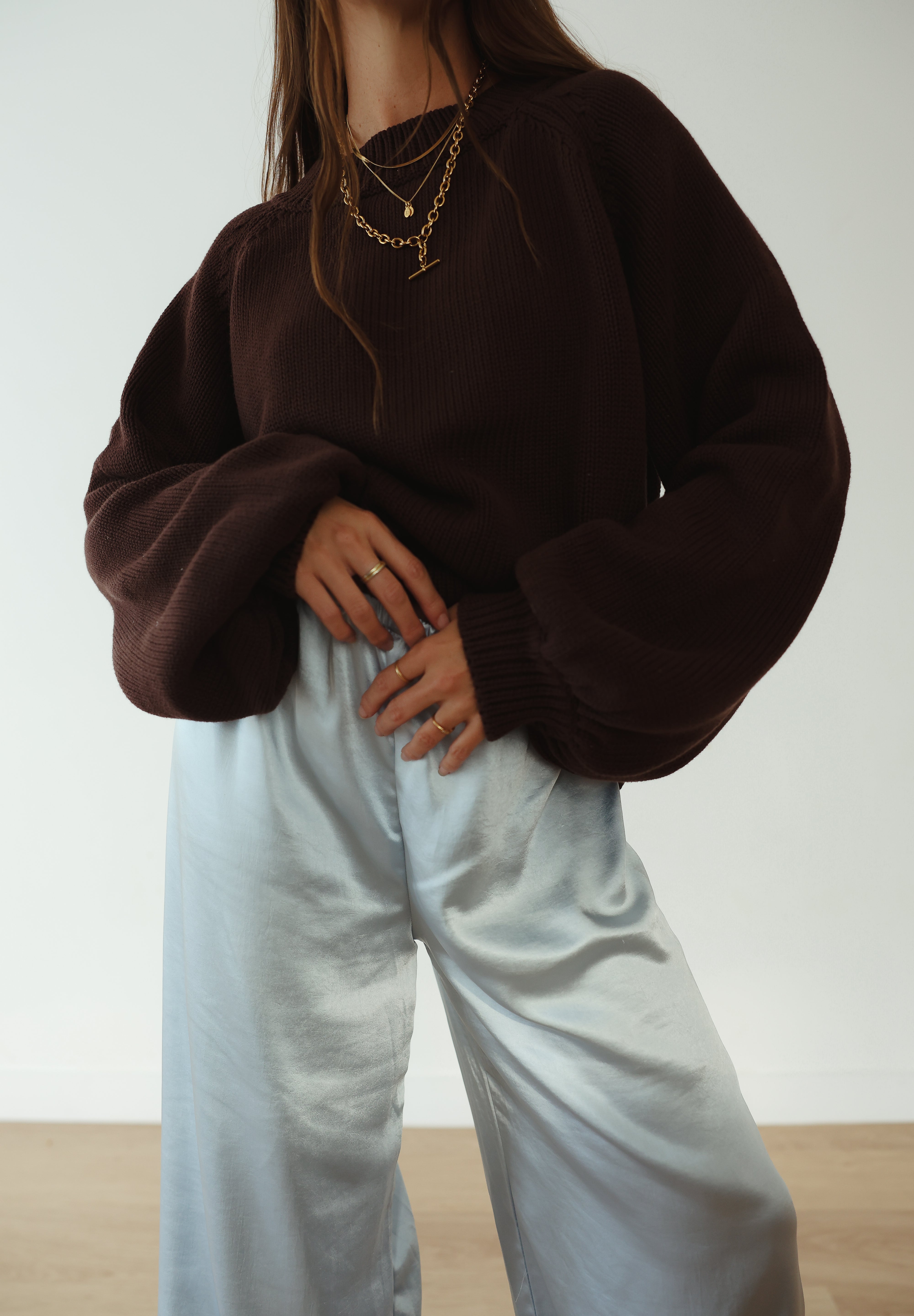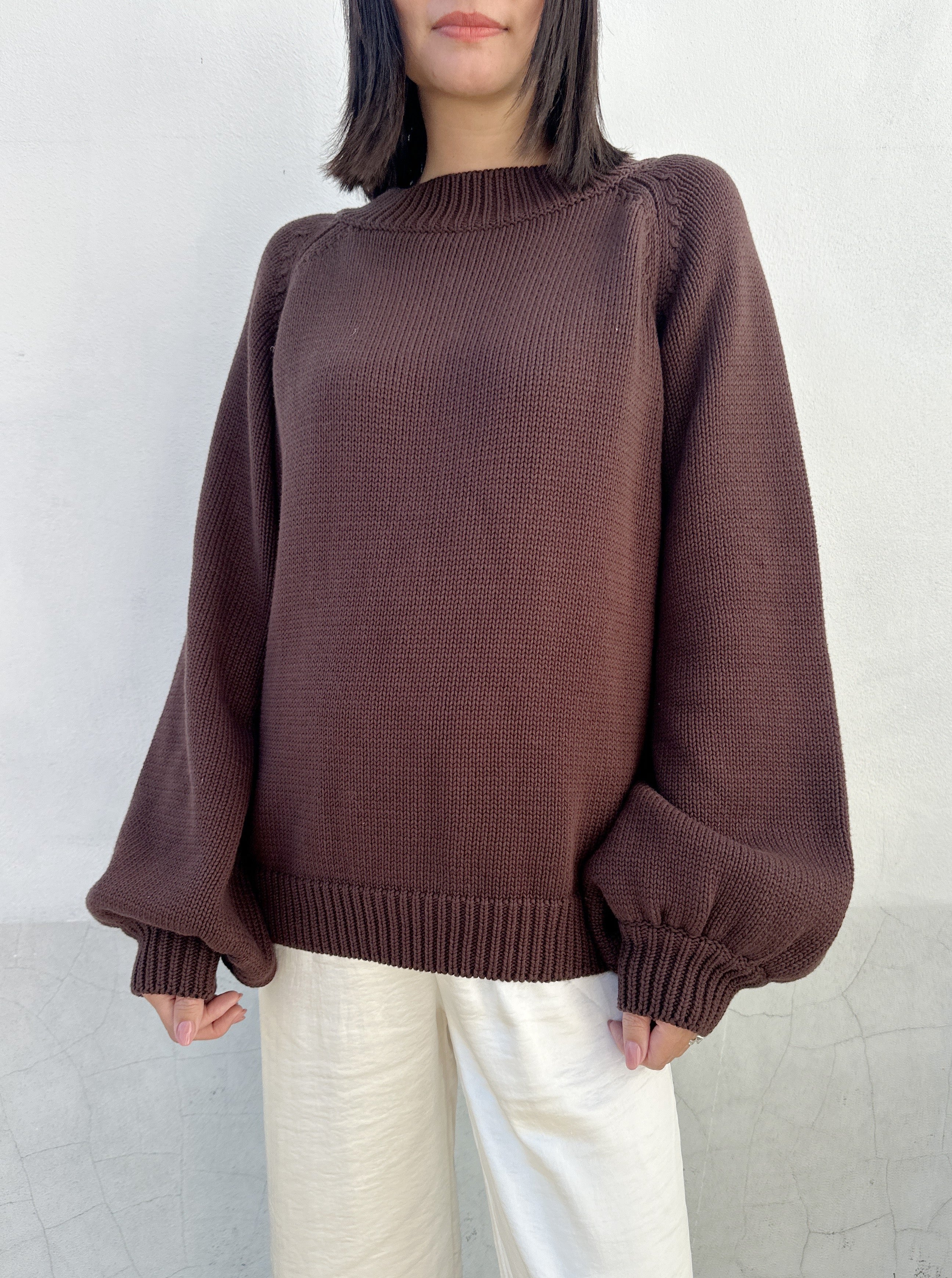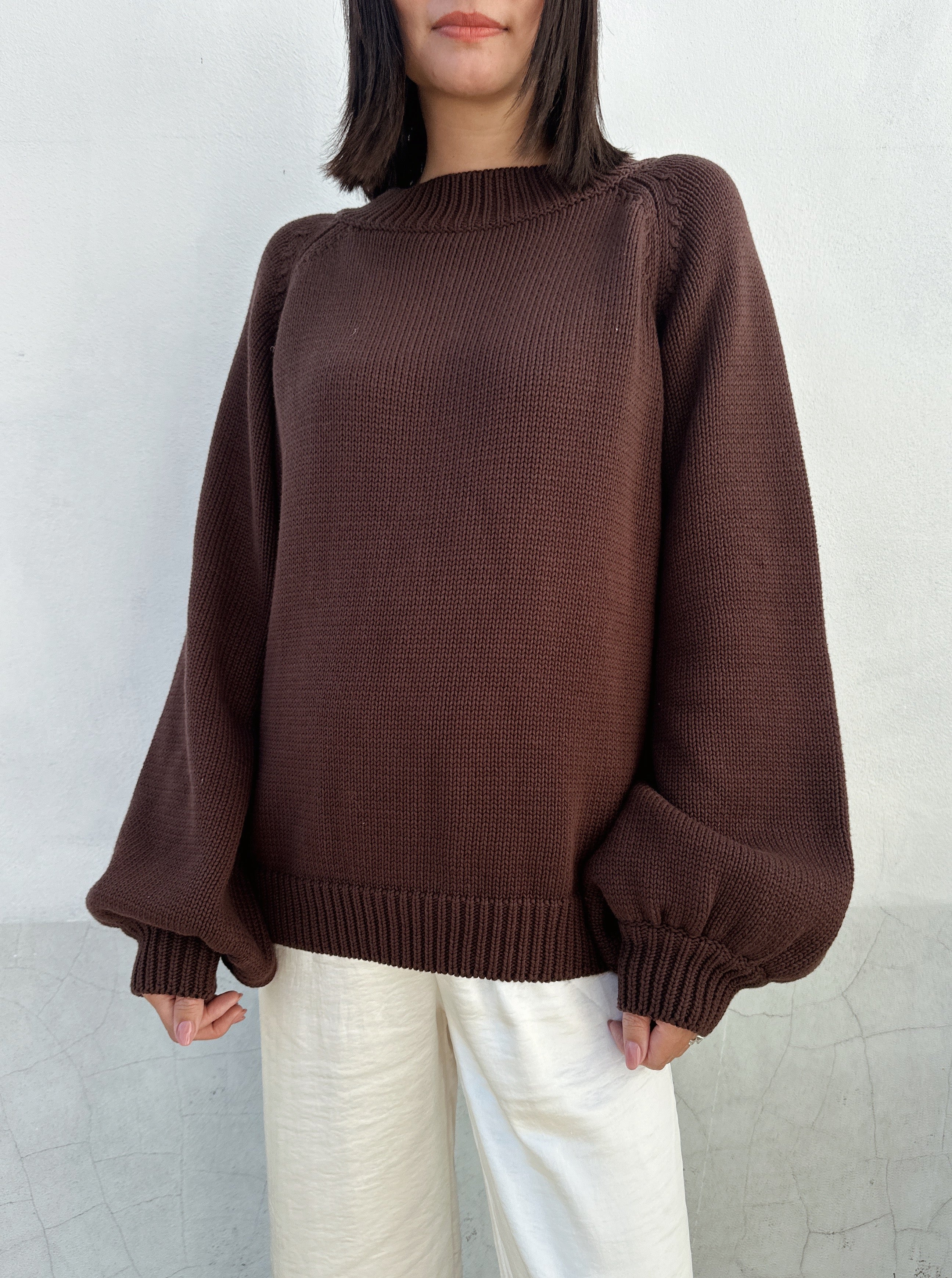 This knit is an oversized, relaxed fit (making it bump friendly!) with balloon sleeves, rib detail cuffs and a wide rib neck.