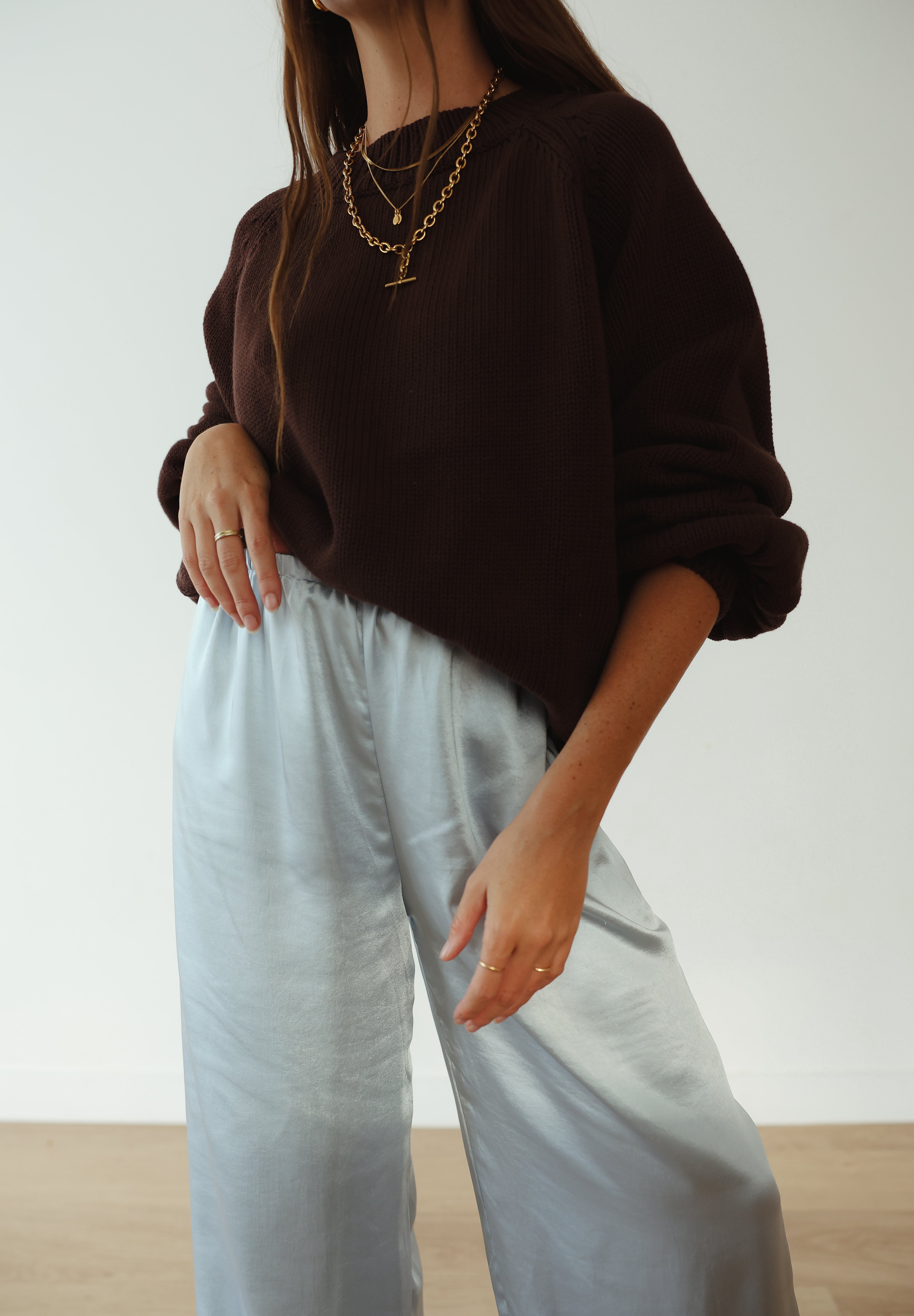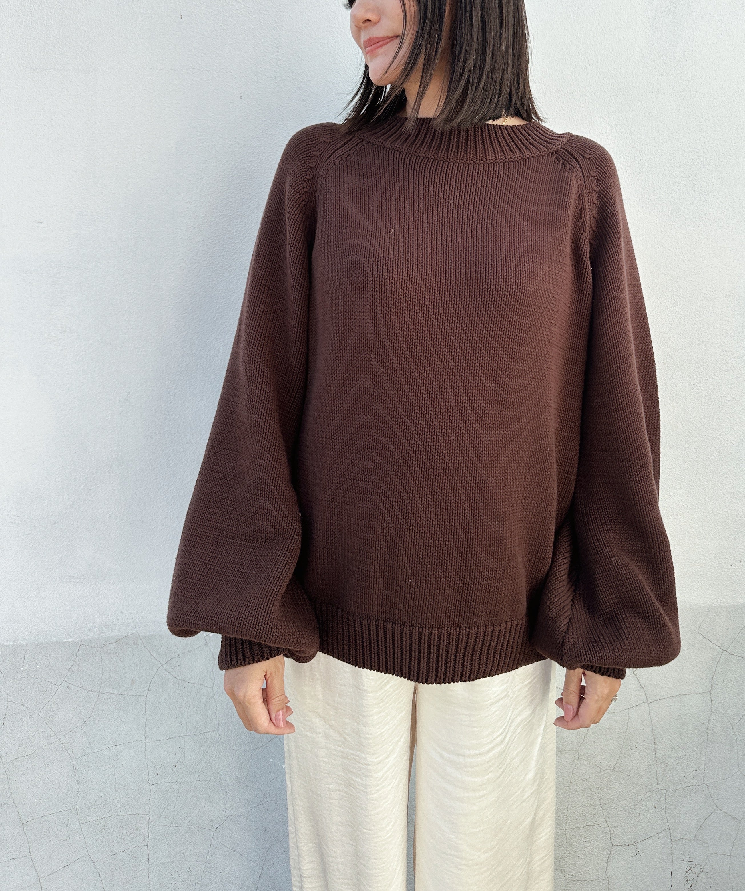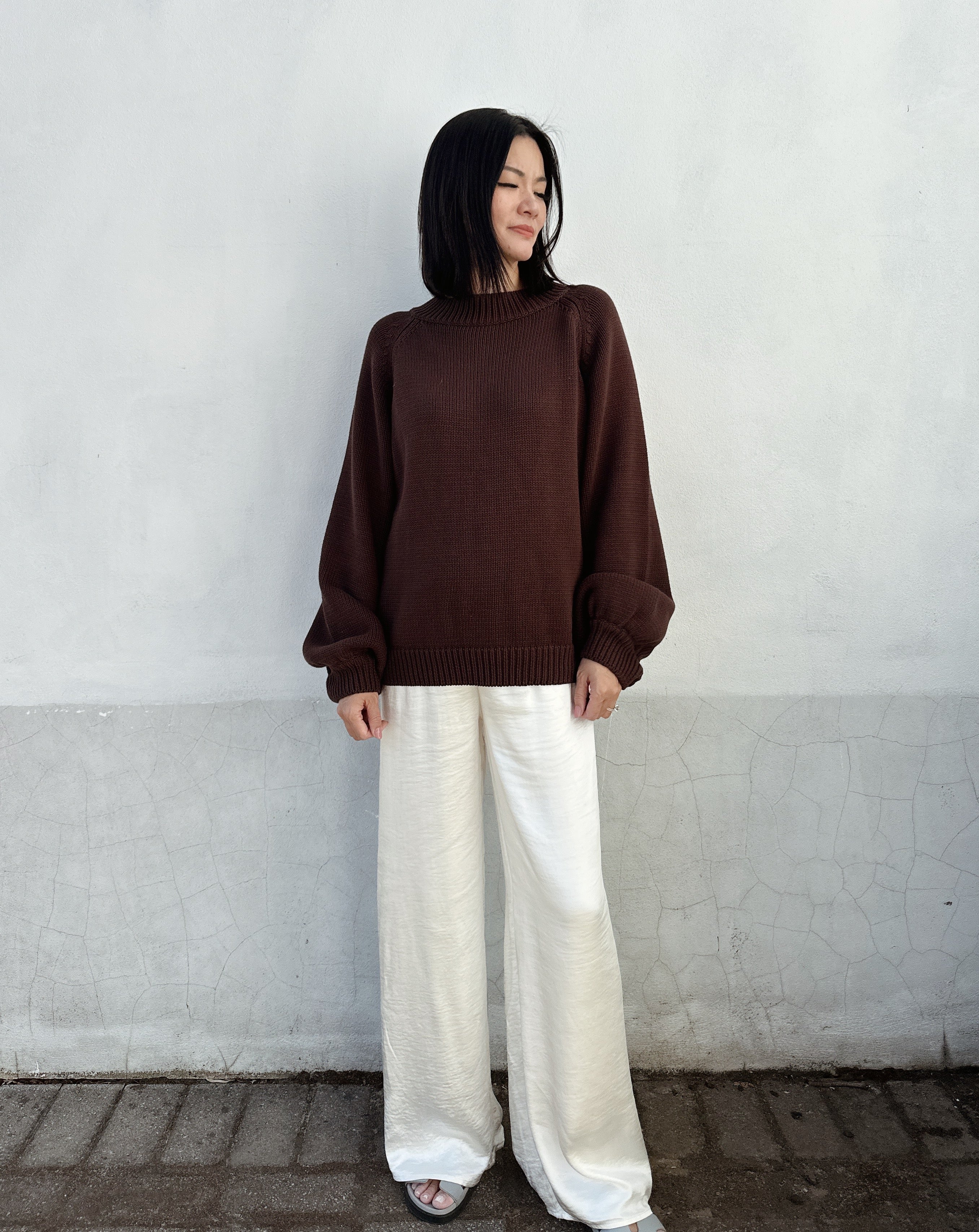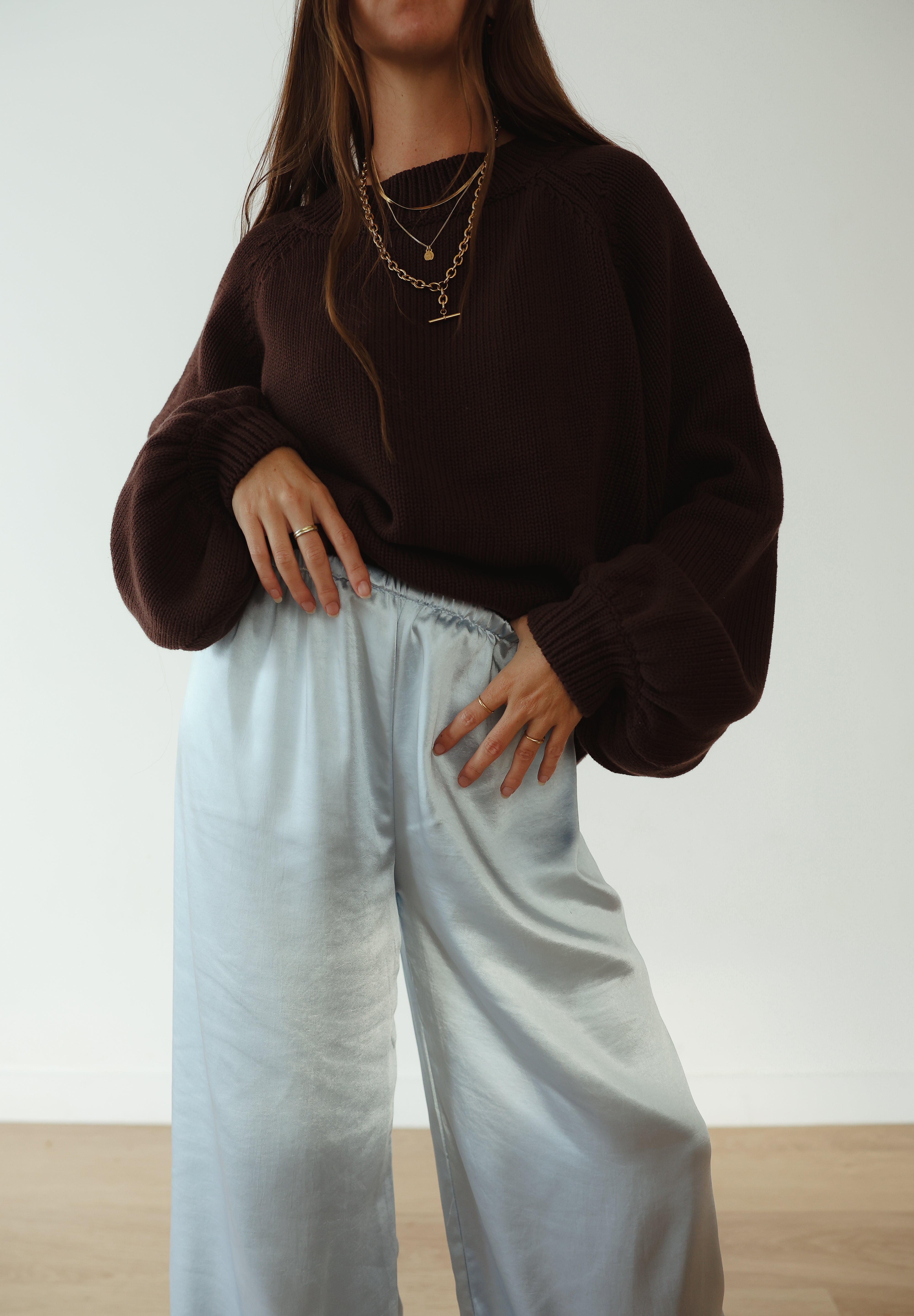 This knit is an oversized, relaxed fit (making it bump friendly!) with balloon sleeves, rib detail cuffs and a wide rib neck.