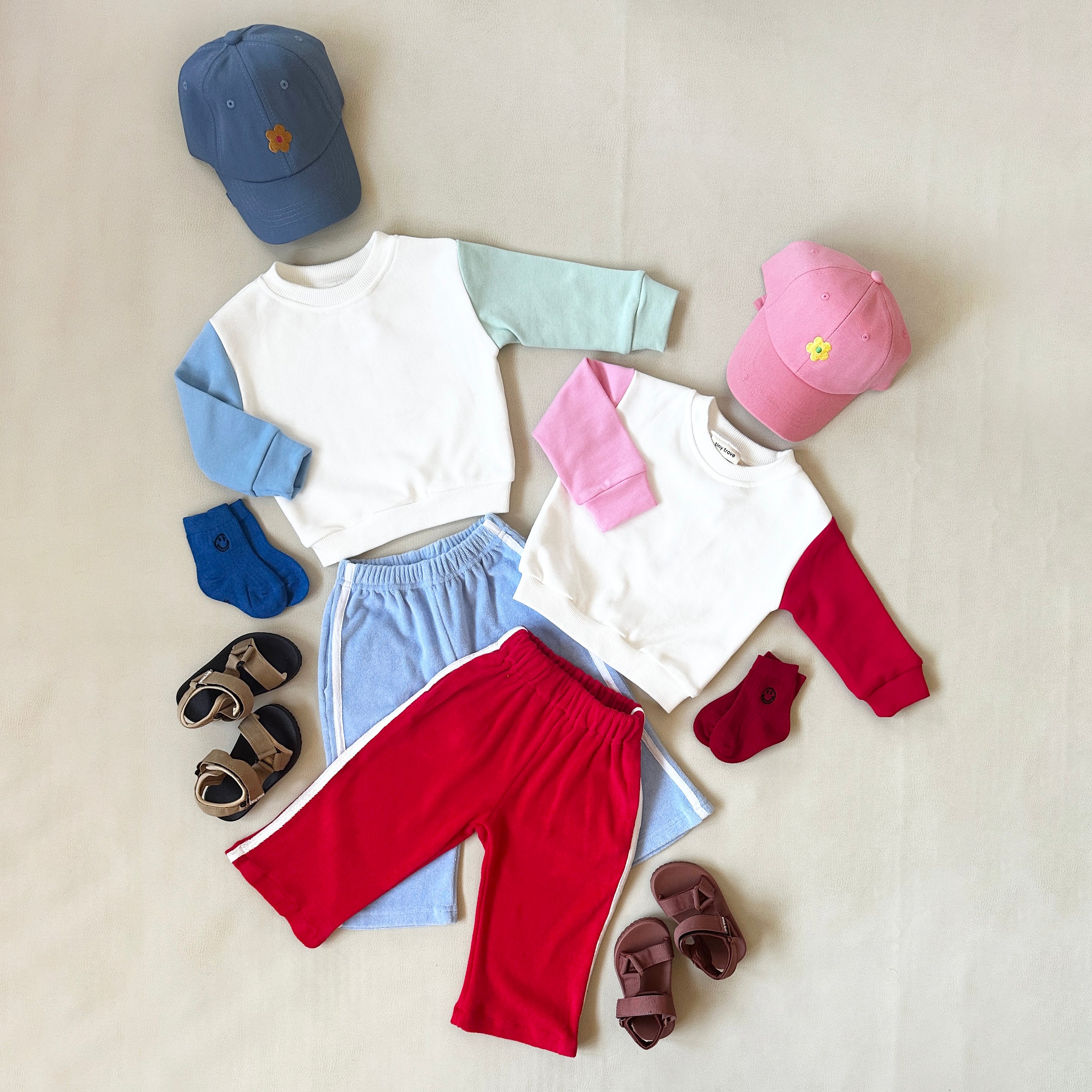 Style with our Darcy Racer Pants in Red, Olympia Velcro Sandals in Brick, Face Socks in Cherry and our Floral Embroidery Cap in Pink