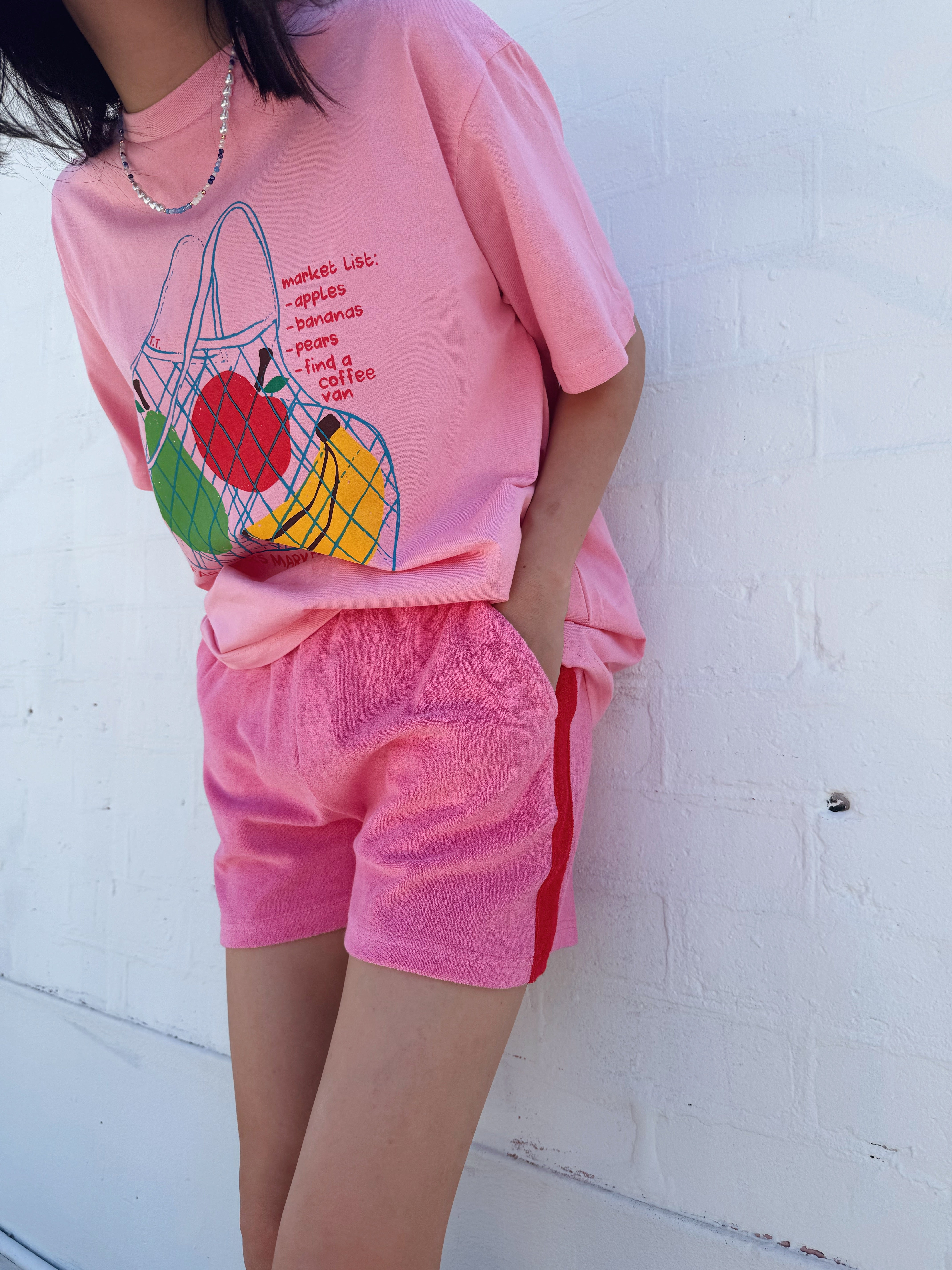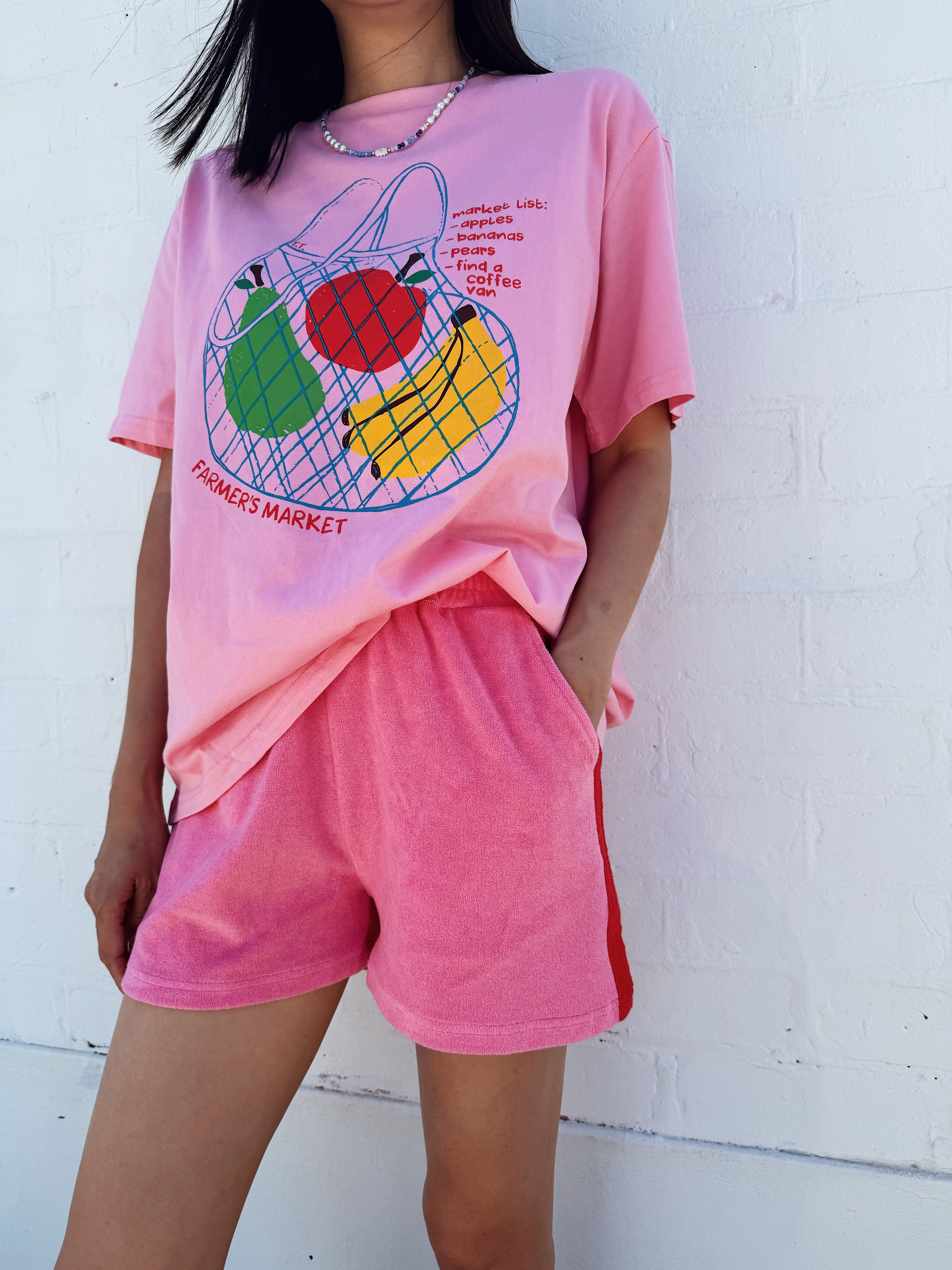 Sandy (Aus size 8) wears a size S, styled with our Adult Farmer's Market Tee in Bubblegum