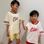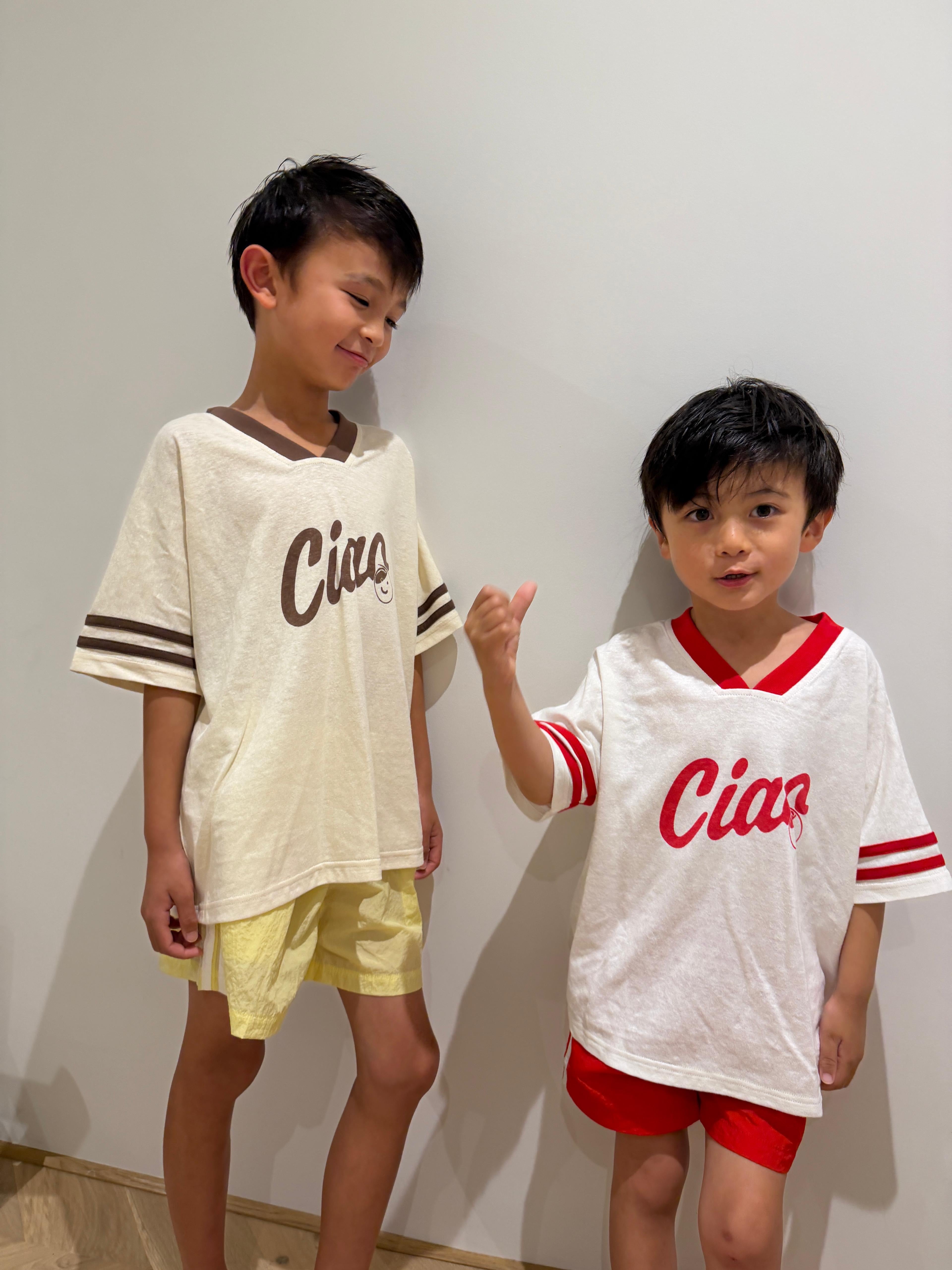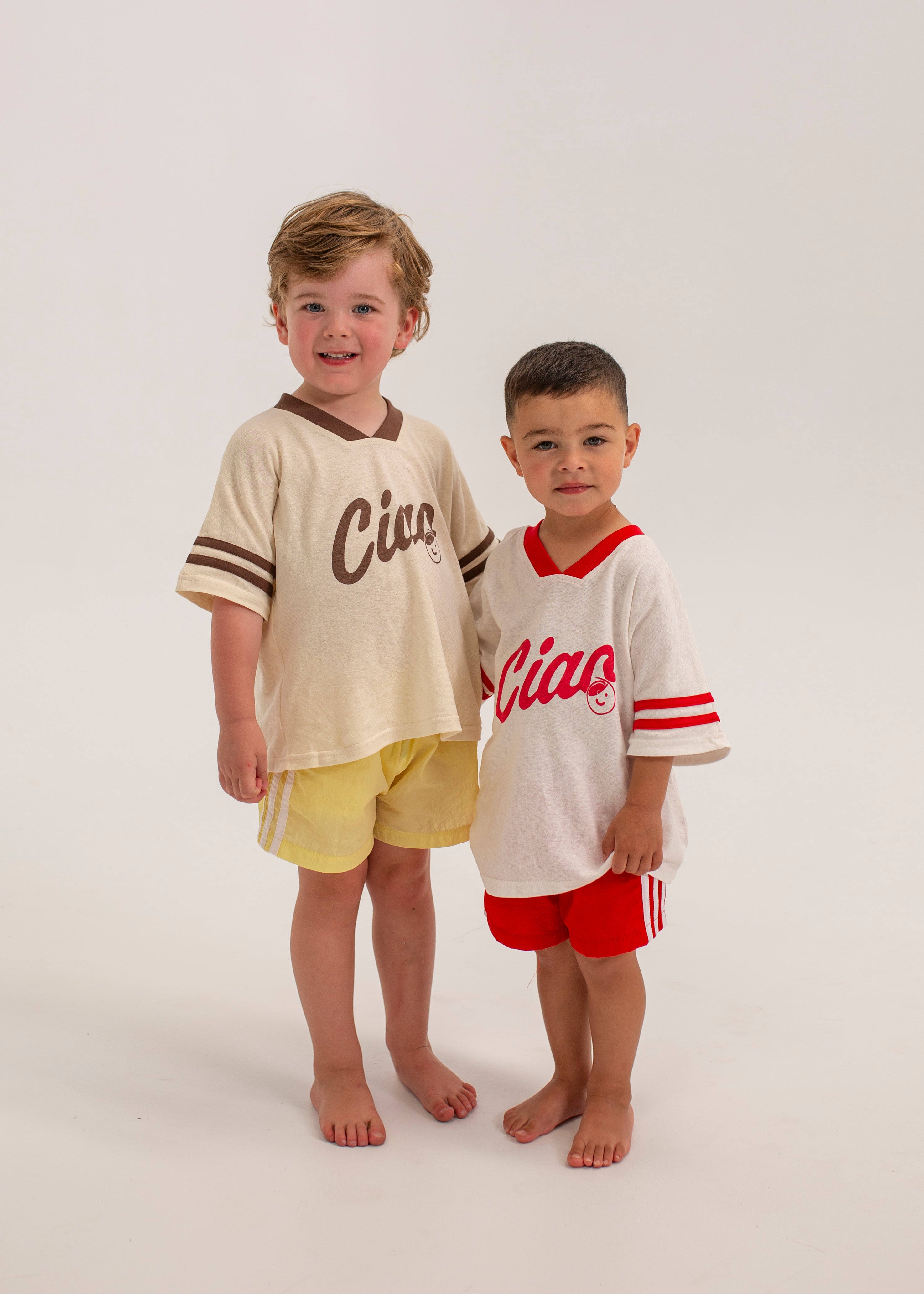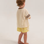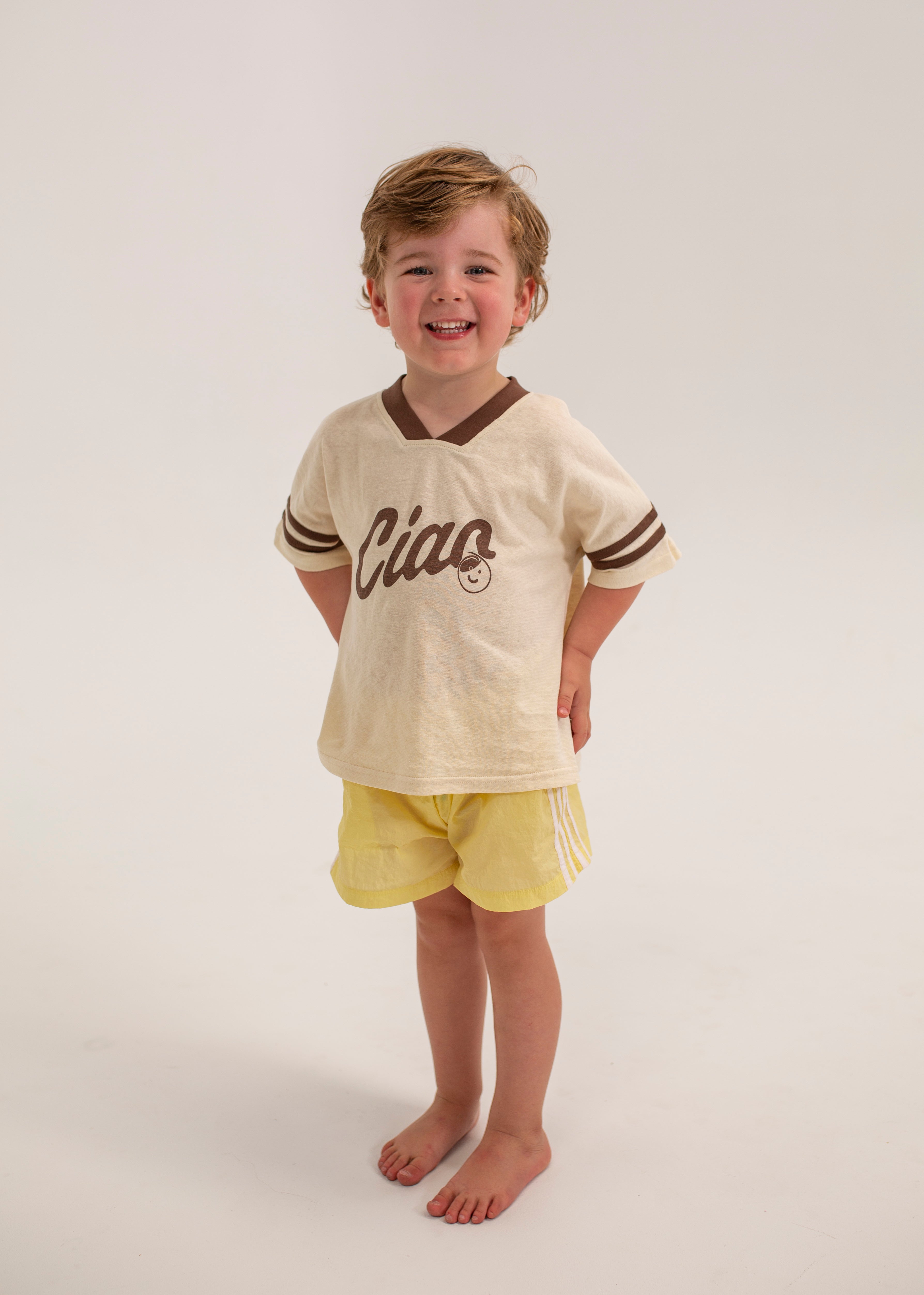 Parker (7yo) wears size 7Y, styled with our Ciao Smiley Tee in Cream/Cocoa