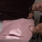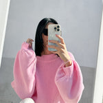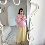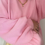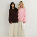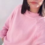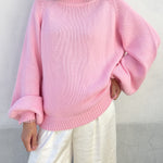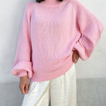 This knit is an oversized, relaxed fit (making it bump friendly!) with balloon sleeves, rib detail cuffs and a wide rib neck.