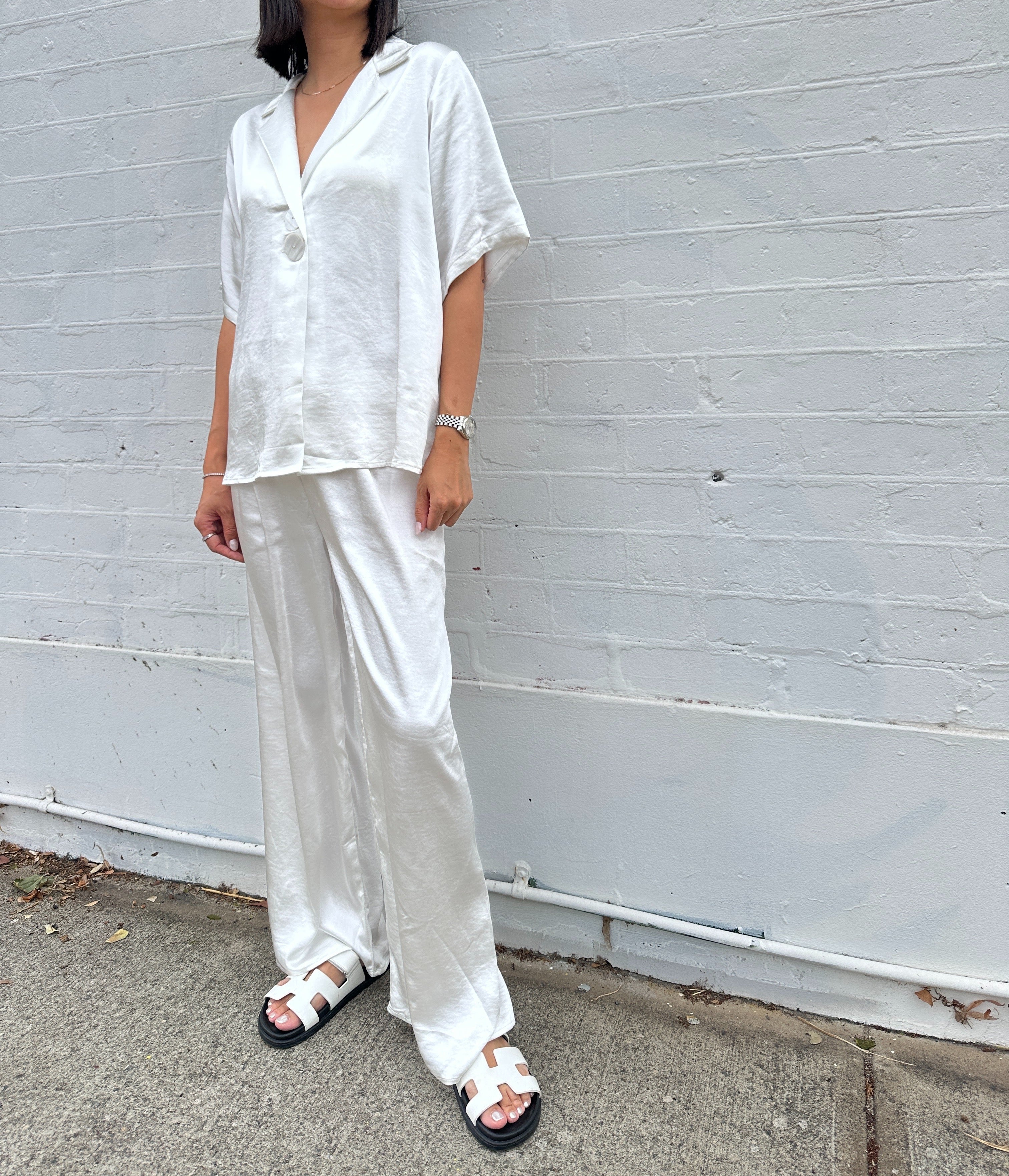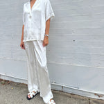 This set includes a minimal but stylish shirt and pants that deserves a place in every wardrobe. The shirt features a soft collar and lapel drawn together by two accent shell buttons. The pants feature an elasticated waistband for comfort and a slim straight leg, and have a silky premium feel that drapes effortlessly against the leg.
